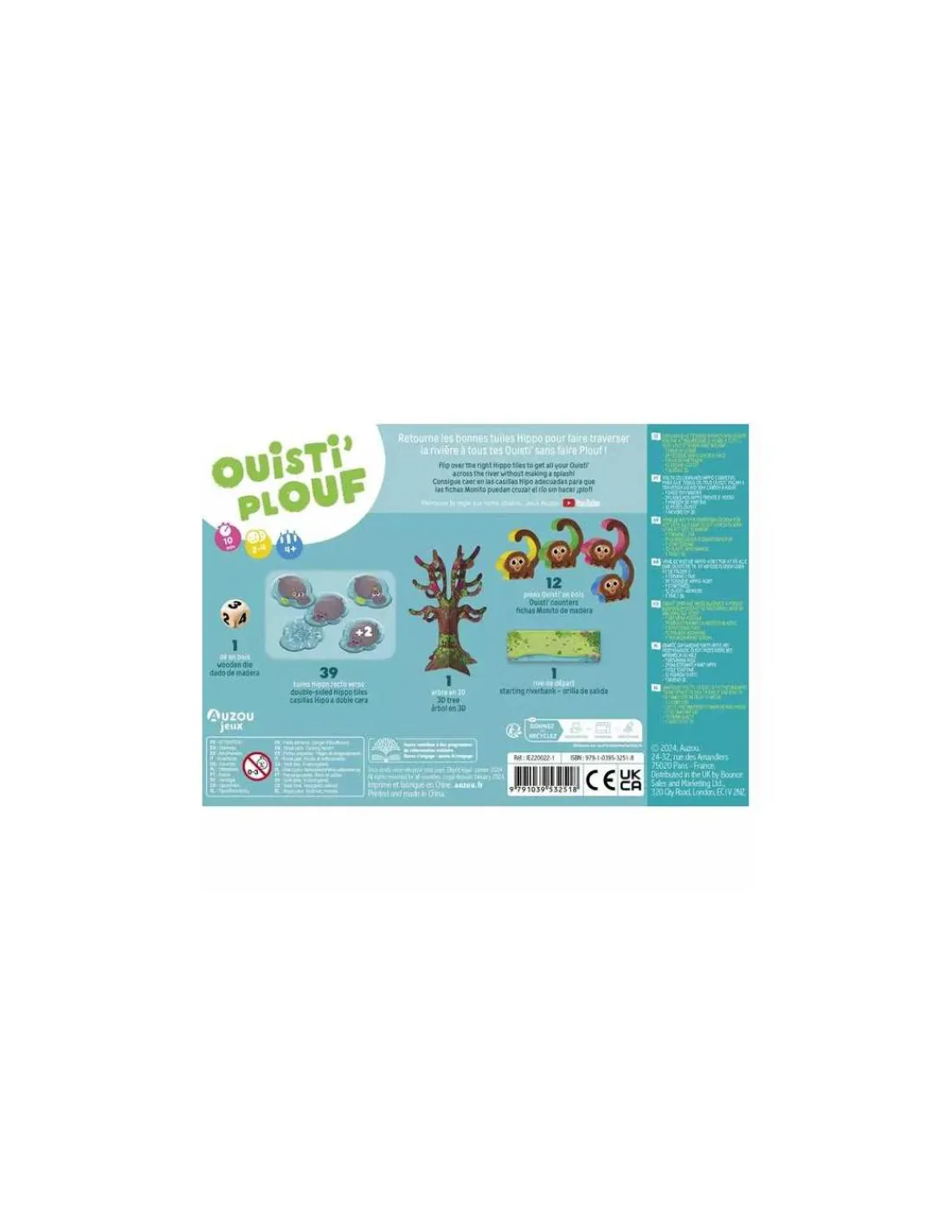 La boite de jeu contient 39 tuiles Hippo, 1 rive de départ, 12 pions Ouisti’ en bois, 1 arbre en 3D, 1 dé en bois et les règles du jeu.