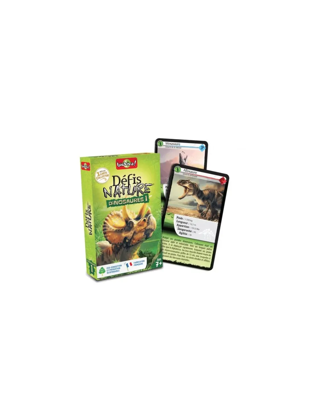 Avec Défis Nature Dinosaures, les joueurs parient sur les points forts de leurs dinosaures (poids, taille, dangerosité…). Le dinosaure le plus fort permet de remporter la carte des autres joueurs. Mais attention aux espèces ayant vécu le moins longtemps sur Terre… elles permettent de retourner la situation à tout moment!