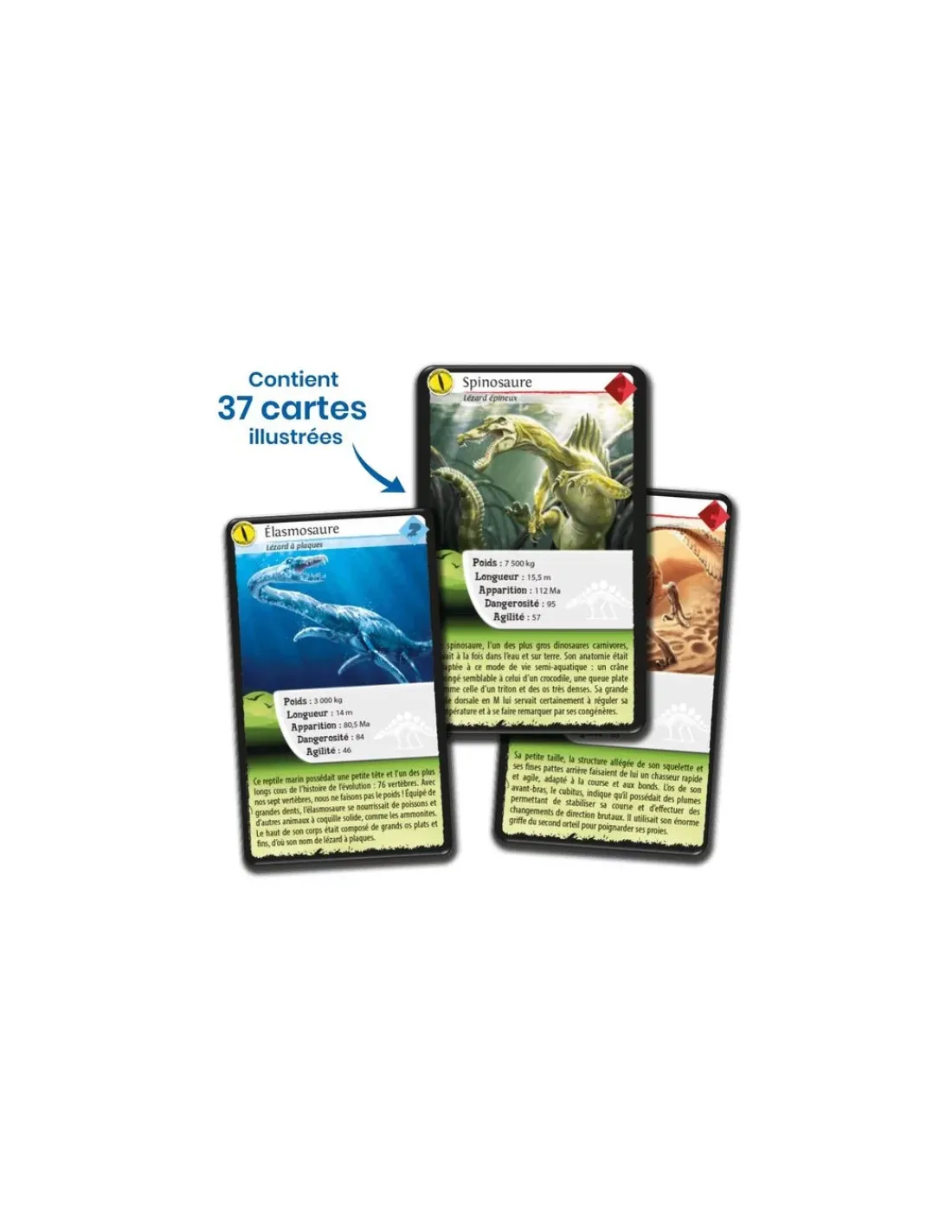 Chaque carte du jeu est illustrée d’un dinosaure, de ses caractéristiques (poids, longueur, apparition en millions d’années écoulées, indice de dangerosité, indice d’agilité) et contient du contenu éducatif pour en savoir plus sur l’espèce. Une carte Collector aléatoire est incluse dans le jeu et permet aux joueurs de découvrir un phénomène naturel (ex : Feu, Arc-en-ciel, Tornade, Éclipse, Grêle, Aurore Polaire…) et entraîne une action spécifique sur la manche.