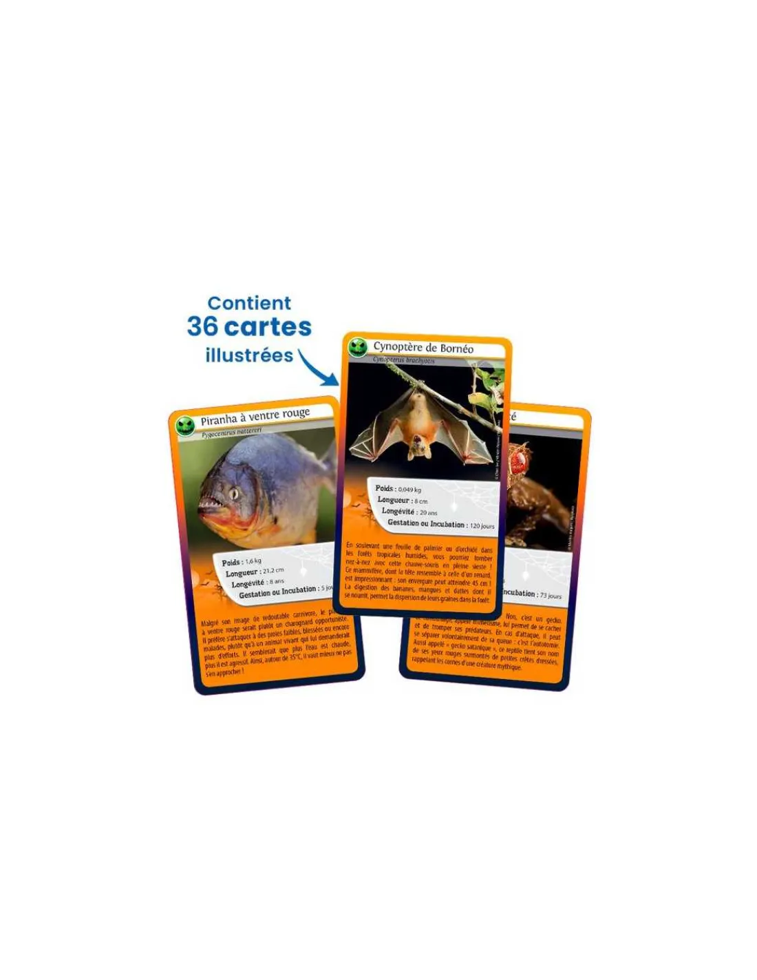 Chaque carte est illustrée d’une photo d’un animal, de ses caractéristiques (poids, longueur, longévité, gestation ou incubation) et contient du contenu éducatif pour en savoir plus sur l’espèce. Parfait pour apprendre en s’amusant!