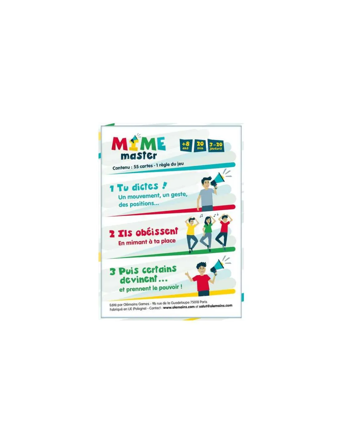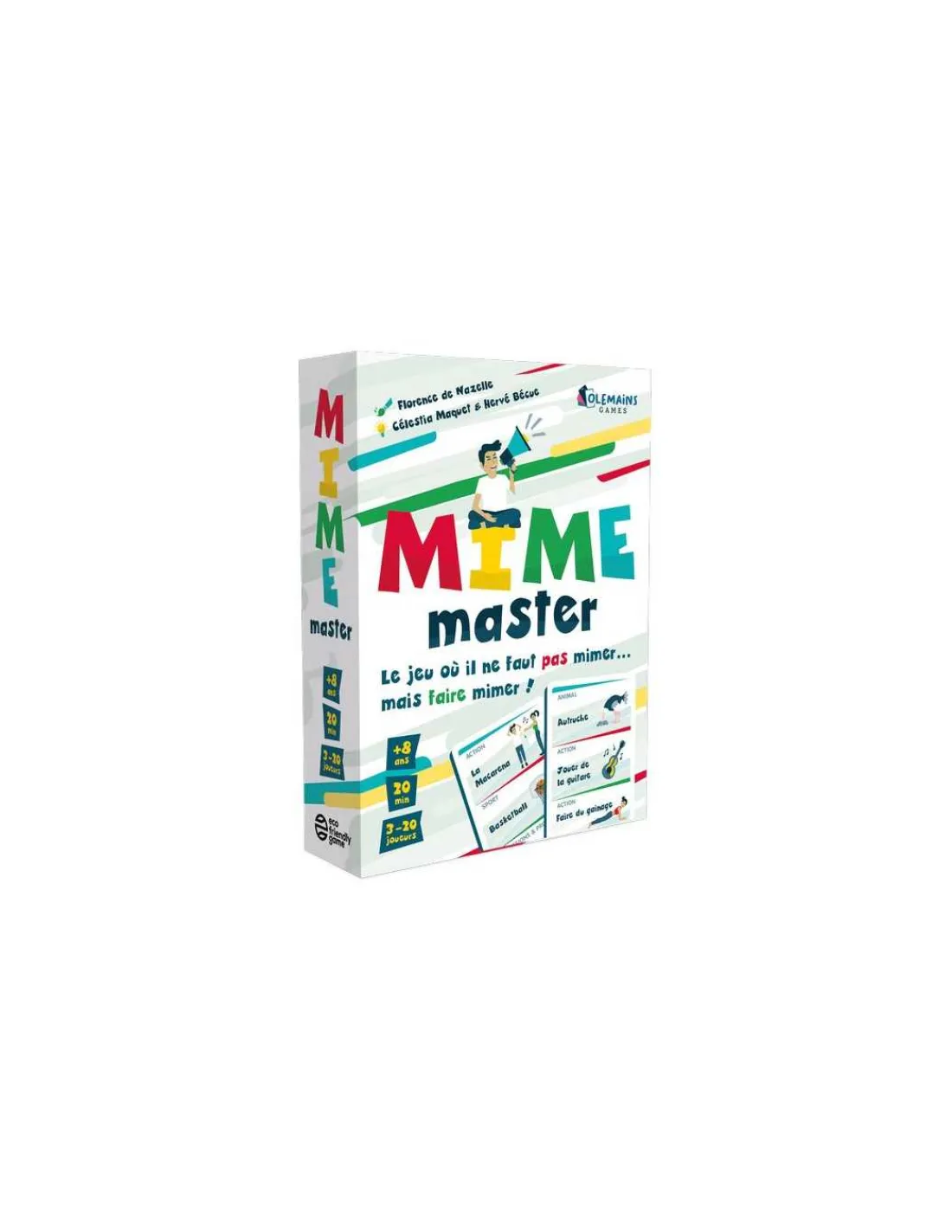 Découvrez le jeu Mime Master de Olemains Games, un jeu d’ambiance pour jouer de 3 à 20 joueurs à partir de 8 ans. Un jeu de société où il ne faut pas mimer…. Mais faire mimer!