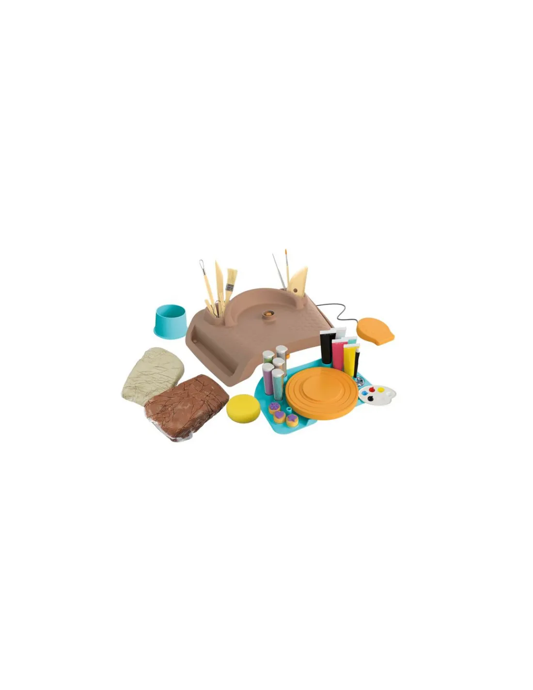 Ce coffret va vous permettre de réaliser des poteries en argile souple que vous pourrez ensuite peindre et décorer avec de la peinture, des tampons ou des paillettes. Appuyez sur la pédale et faites tourner la roue pour mouler et façonner votre poterie. Un atelier de poterie avec emporte- pièce pour centrer le pâton sur la girelle pour faciliter la sculpture.