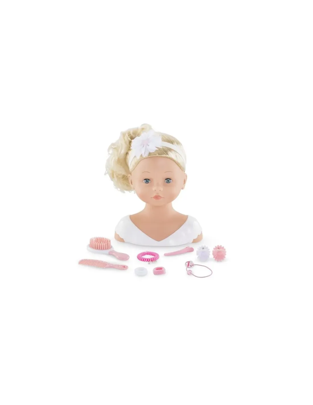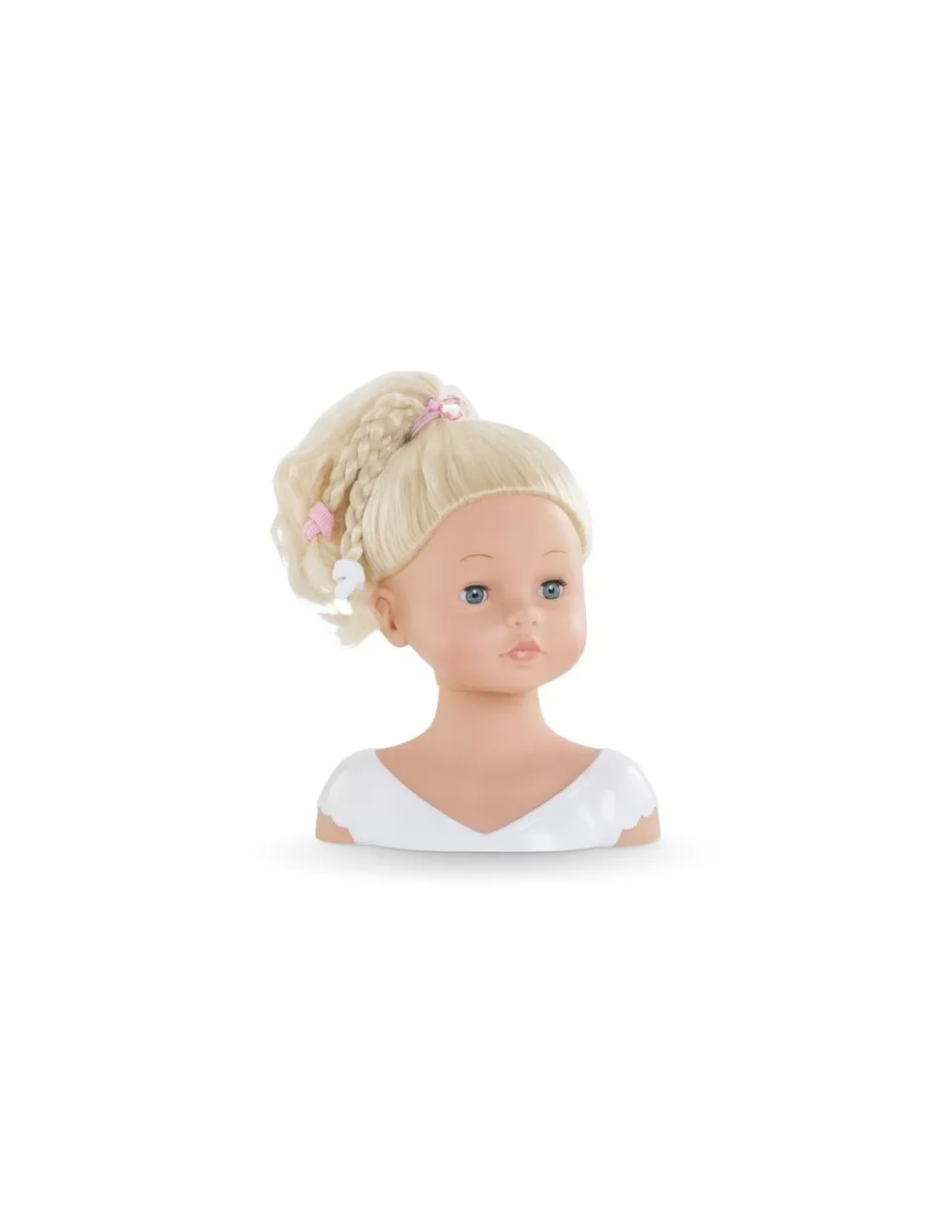 Découvrez la tête à coiffer de Corolle, une tête à coiffer blonde aux yeux bleus fixes avec des cils en vinyle doux au toucher et à la délicate senteur de vanille, un cadeau pour les enfants à partir de 3 ans.