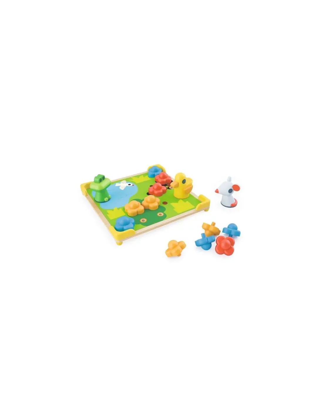 Le coffret comprend 1 planche en bois perforée, 8 planches-décor perforées, 8 cartes « observation », 15 picots fleurs et 3 gros picots animaux (1 souris, 1 canard et 1 grenouille) en volume.
