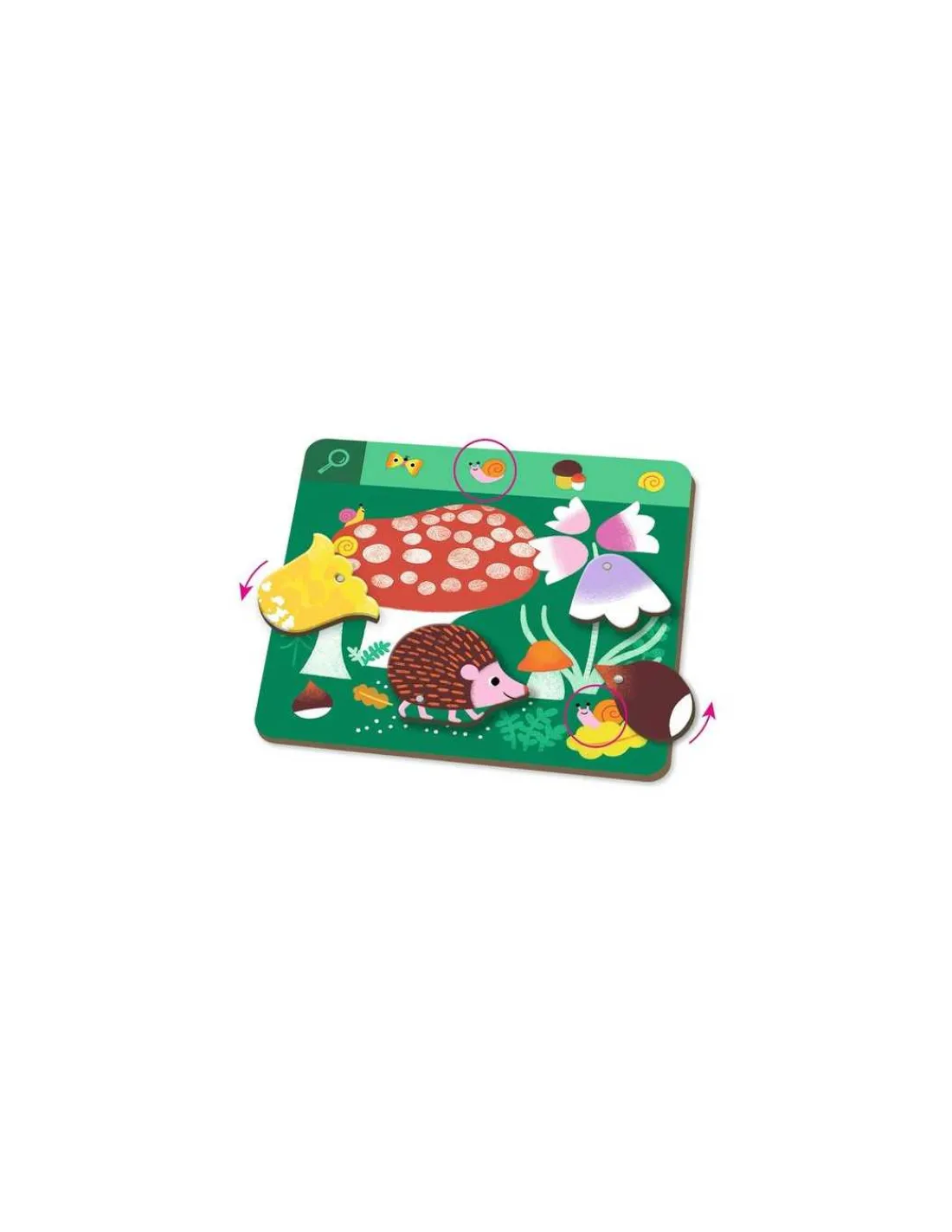 Un jeu d’observation tactile et interactif avec d’adorables petits animaux : un escargot, un oiseau, un hérisson, un écureuil…
