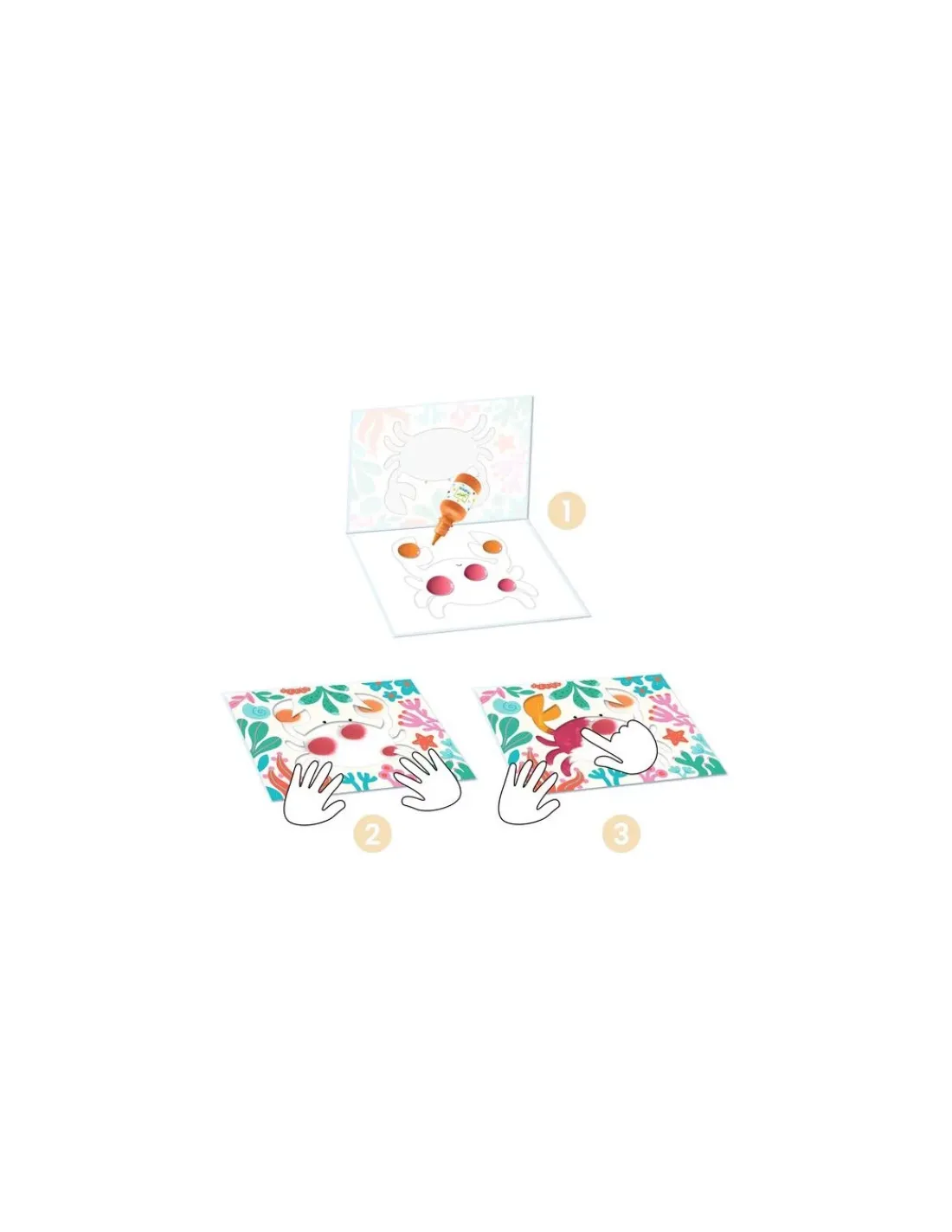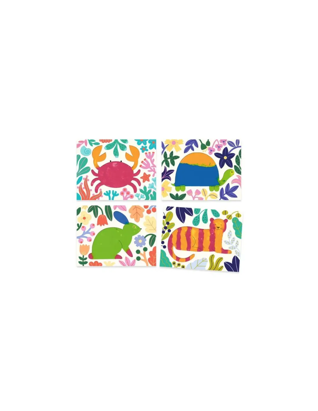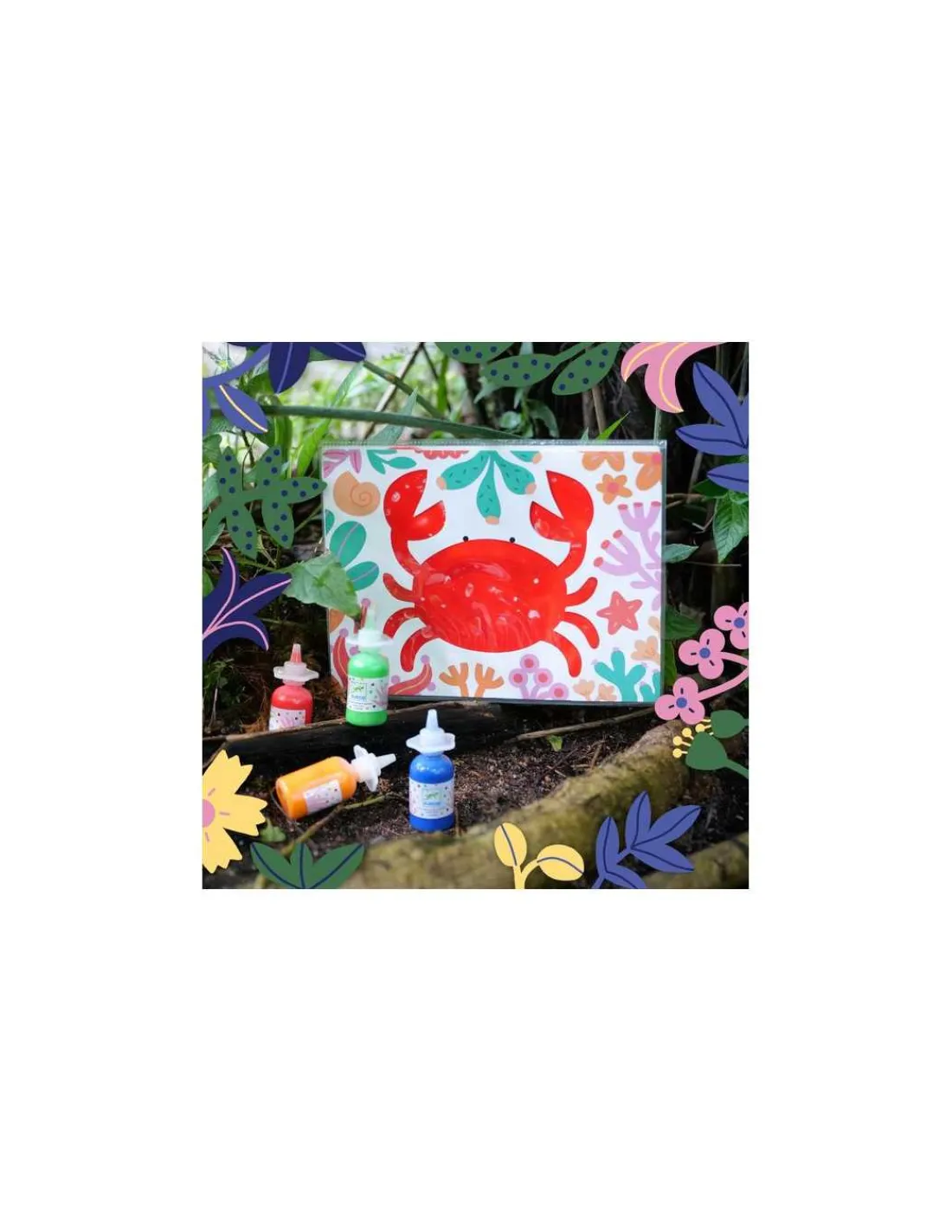 Ce coffret comprend 4 pochettes illustrées, plastifiées et lavables, 4 bouteilles de gouache (rouge, orange, bleu, vert) et 1 livret explicatif pas-à-pas.