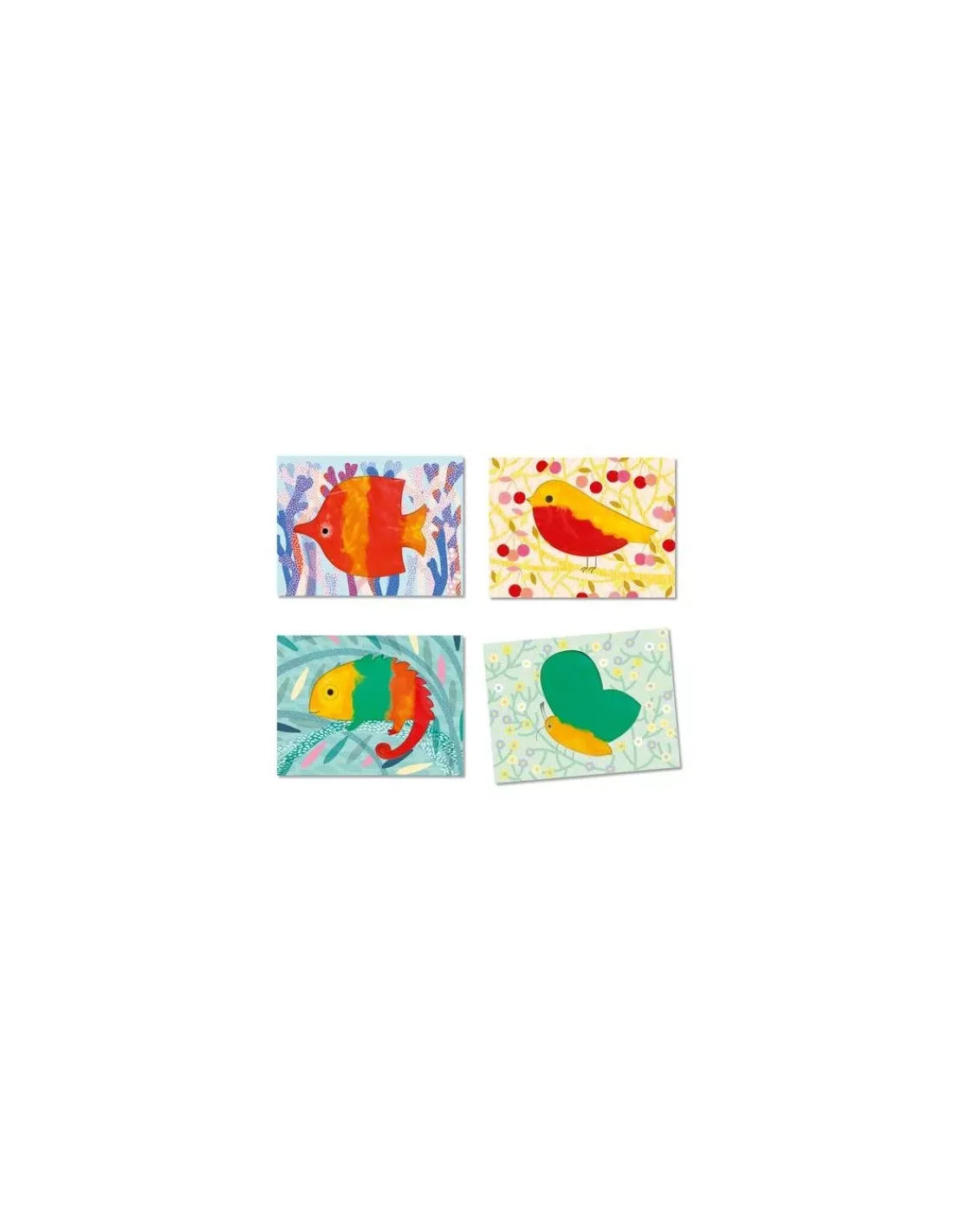 Un coffret de Djeco pour réaliser 4 tableaux avec 4 animaux avec un poisson, un oiseau, un papillon et un caméléon.