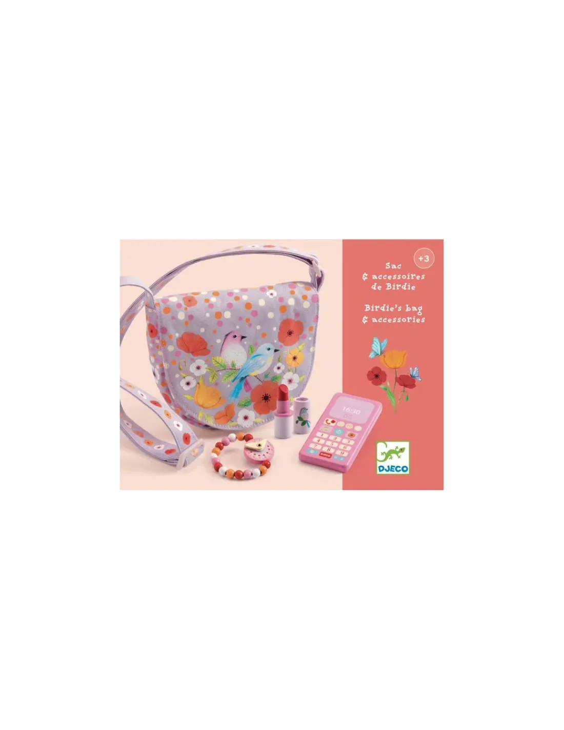 Découvrez le sac et accessoires de Birdie de Djeco, un joli sac à main et ses accessoires en bois pour les enfants à partir de 3 ans. Un sac à main en coton joliment illustré d’oiseaux, qui contient des accessoires en bois pour faire comme les grandes : une montre, un téléphone et un rouge à lèvres.