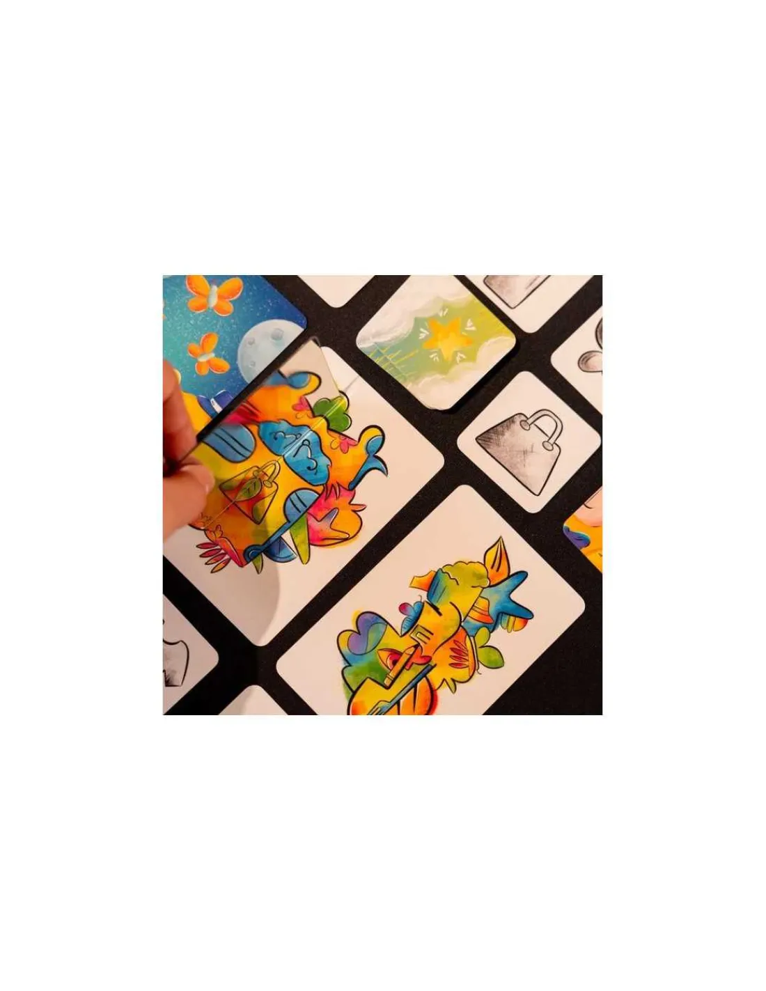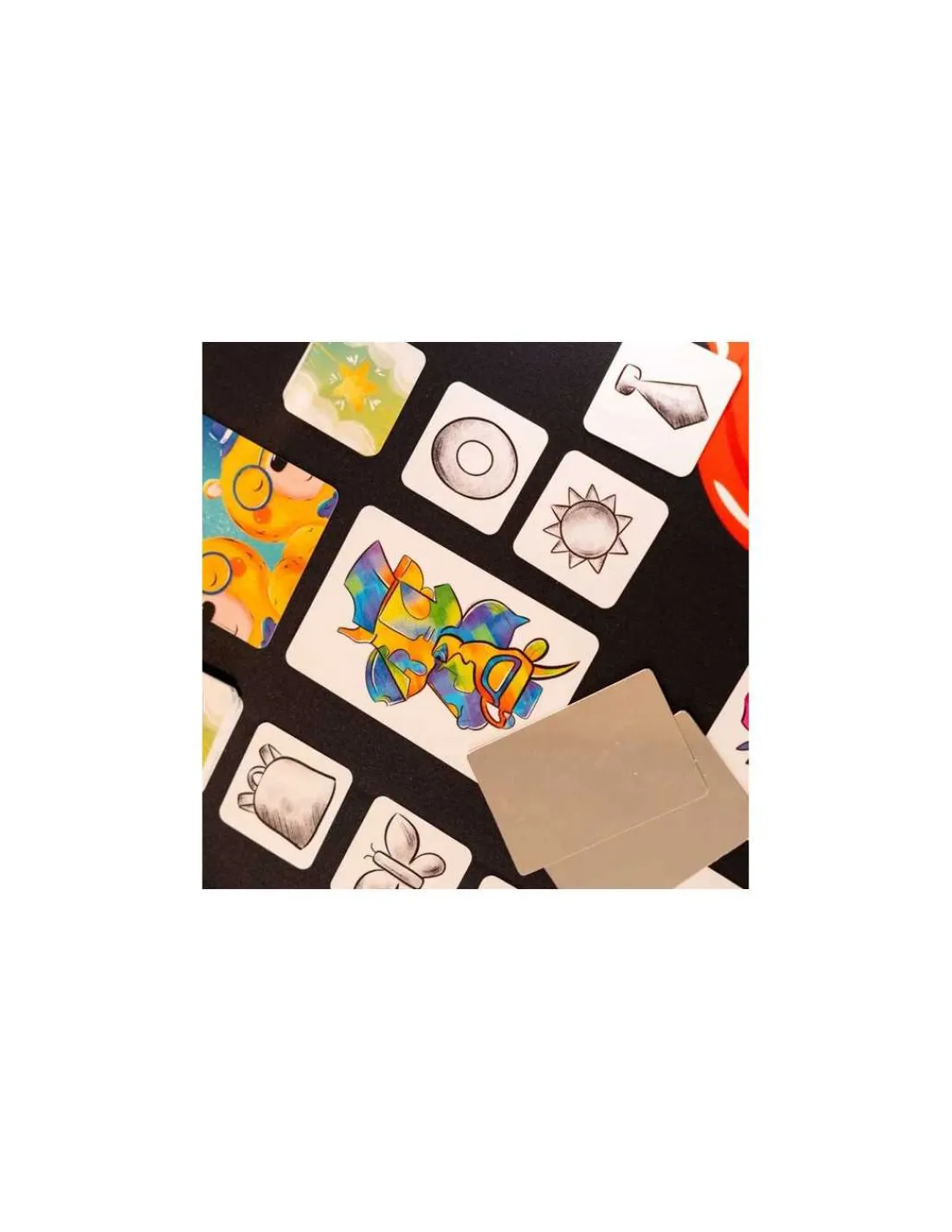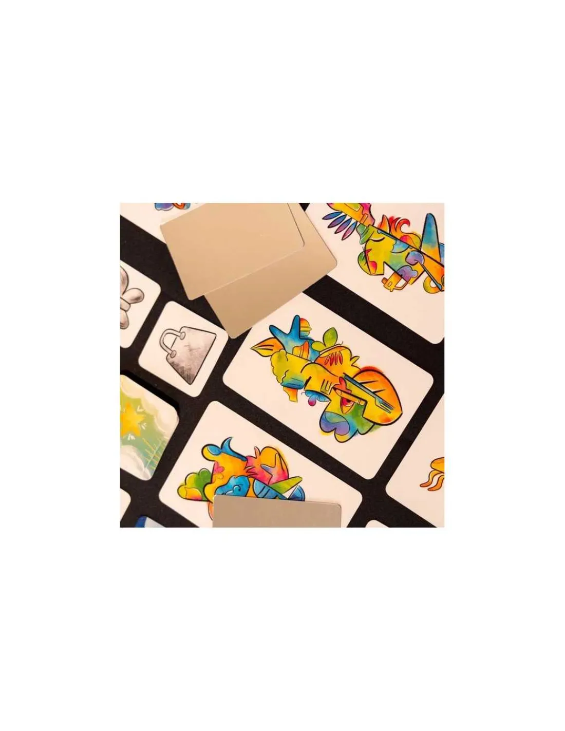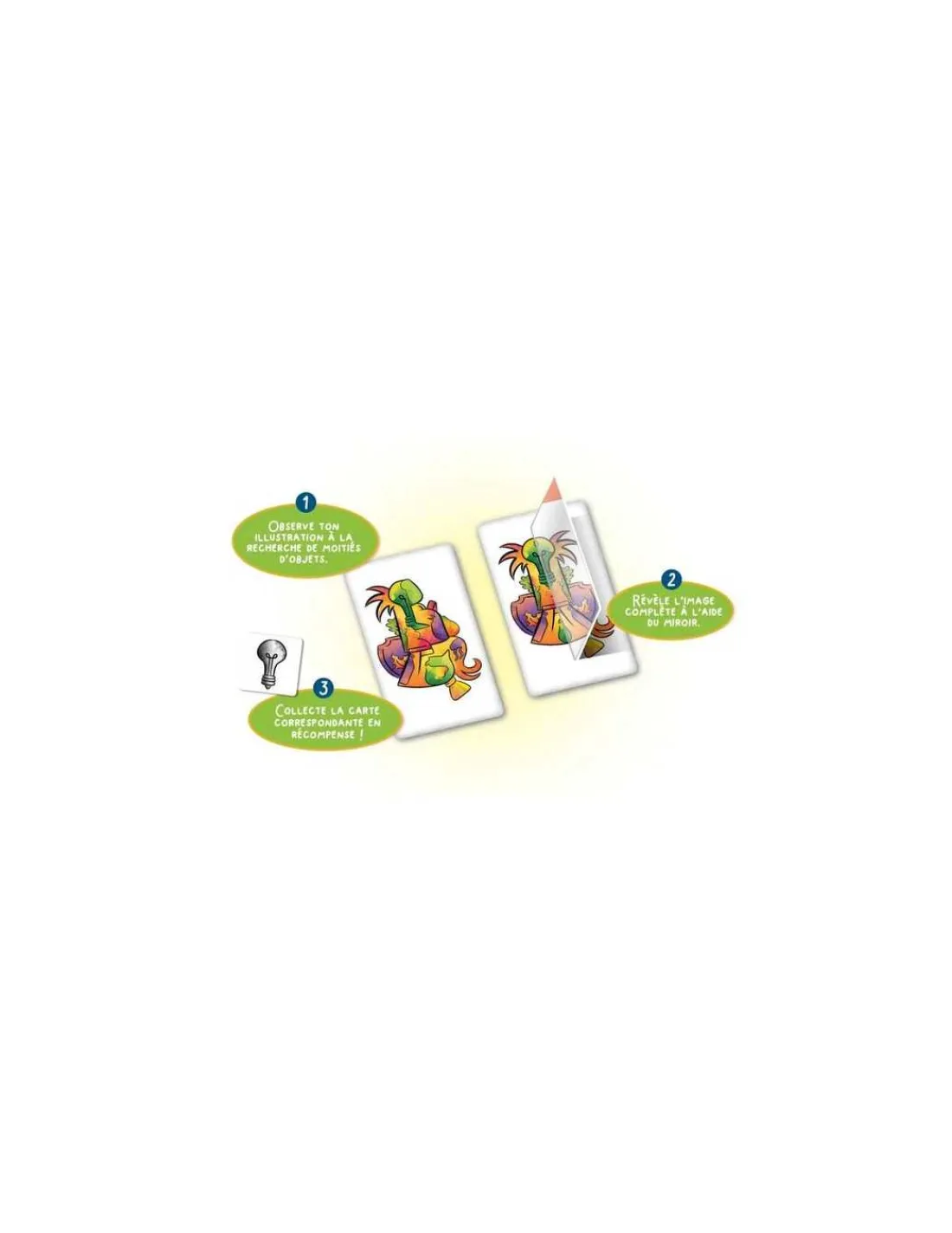 La boite de jeu contient 40 grandes cartes avec une illustration couleur représentant des moitiés d’objets entremêlées, 64 petites cartes avec des objets en noir et blanc, 6 miroirs et la règle du jeu.