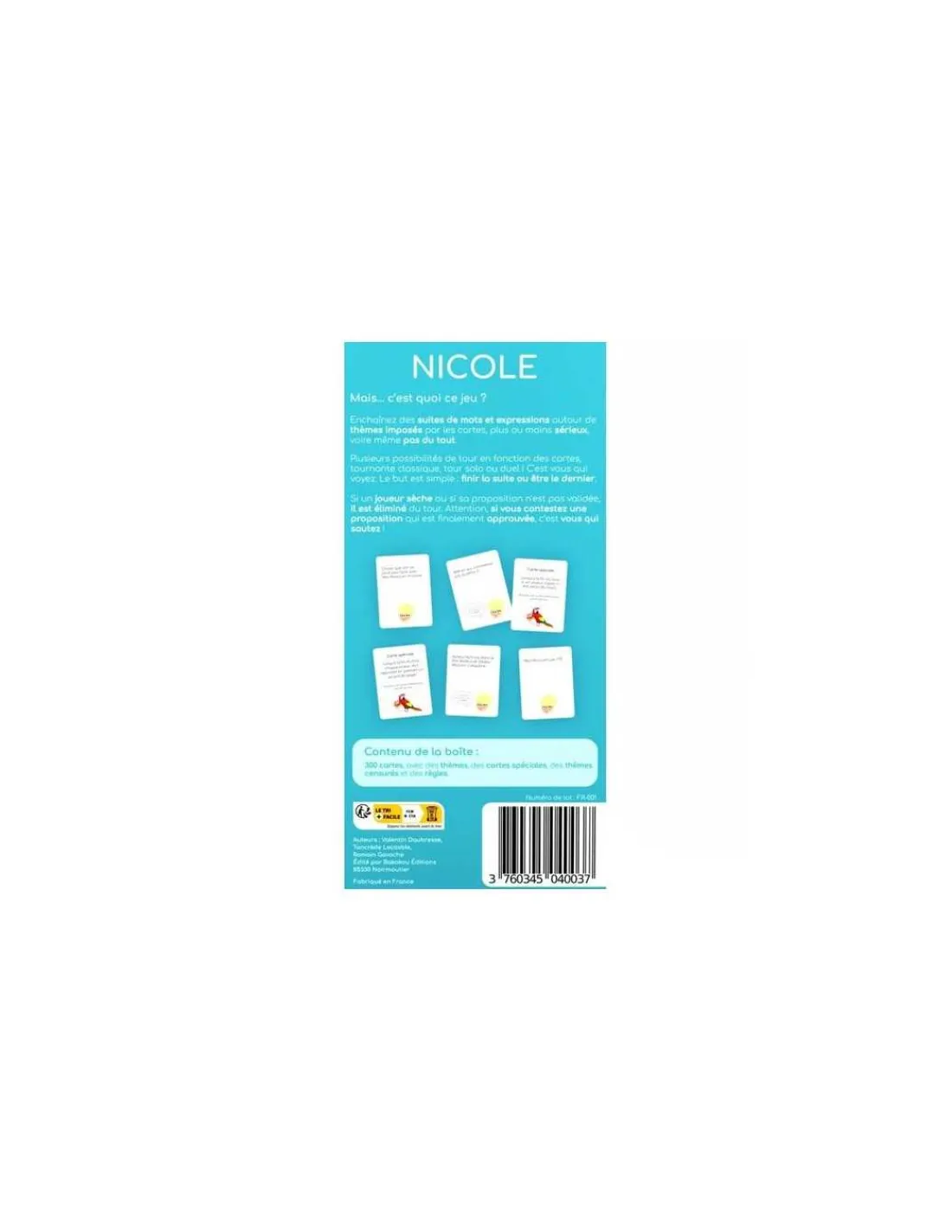 Découvrez le jeu Nicole de l’éditeur Bakakou, un jeu d’ambiance, dans lequel vous devrez enchainer des suites de mots et d’expressions autour de thèmes imposés par les cartes. Un jeu de société fun, rapide et instinctif parfait pour vos soirées entre amis.