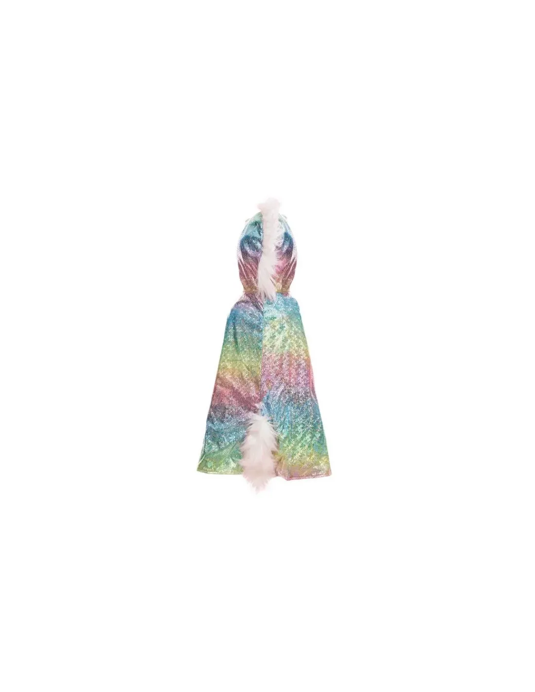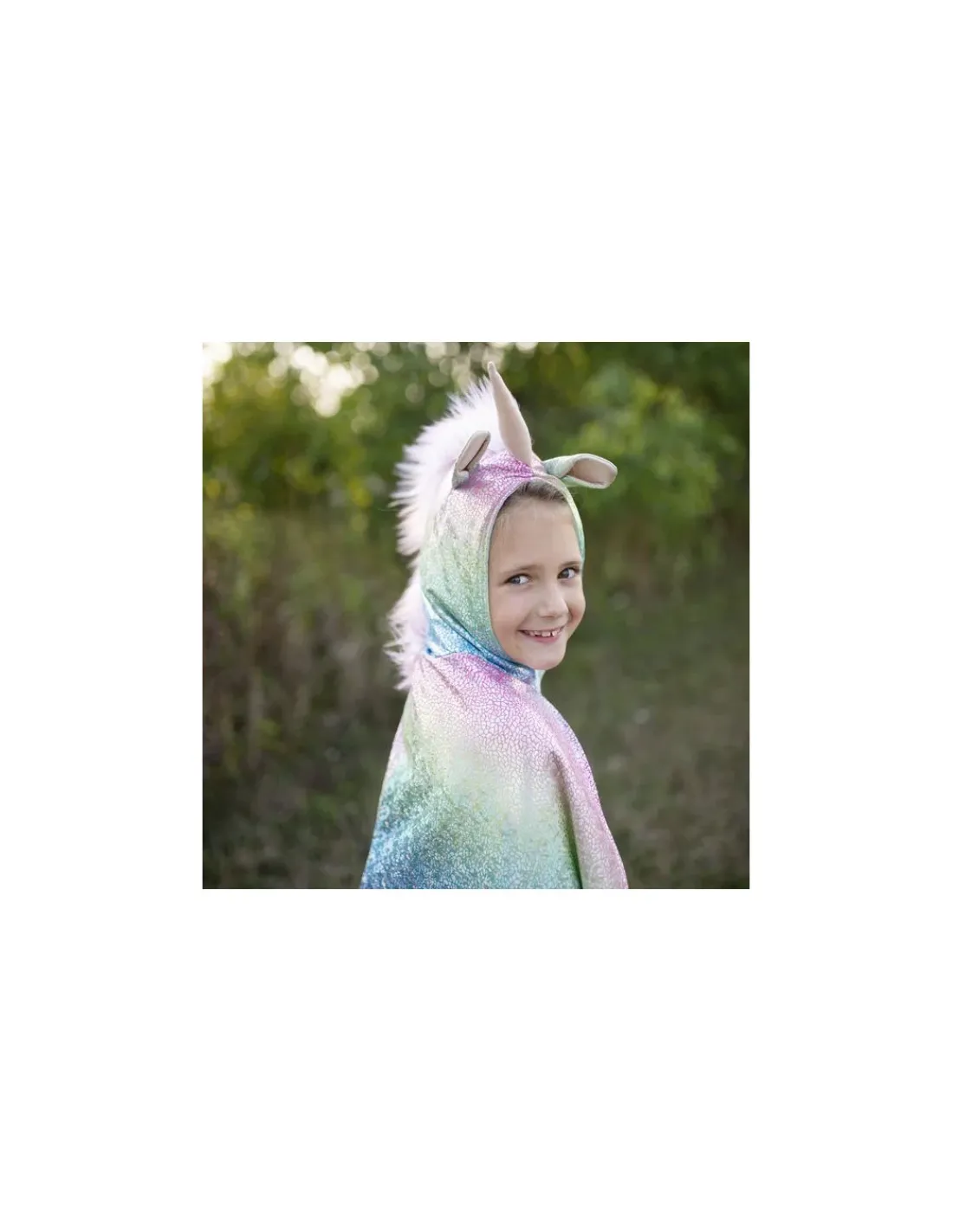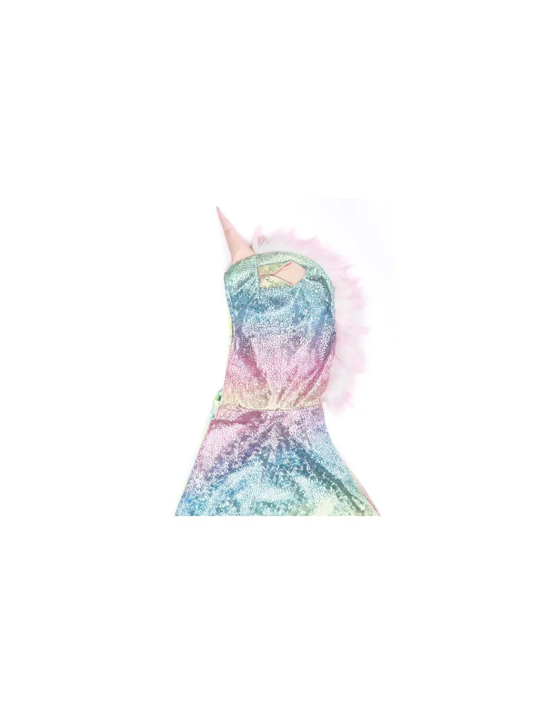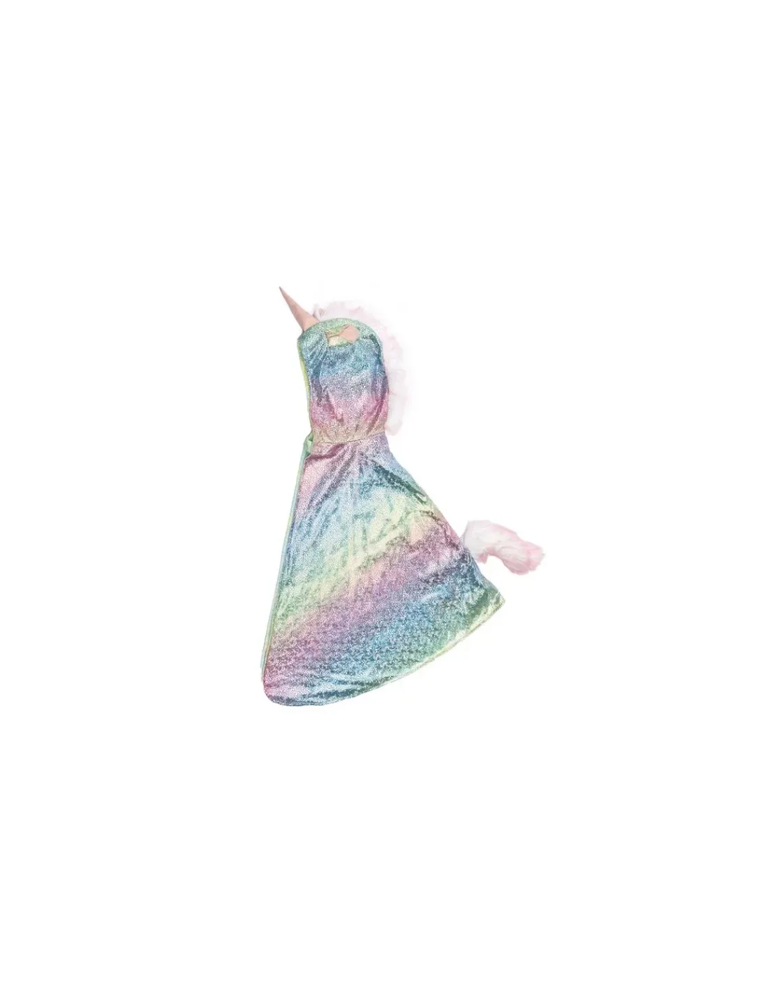 Cette cape réversible est faite de velours texturé avec des écailles du côté dragon et d’un tissu arc-en-ciel scintillant côté licorne avec une queue et une crinière en tissu peluche tout doux.