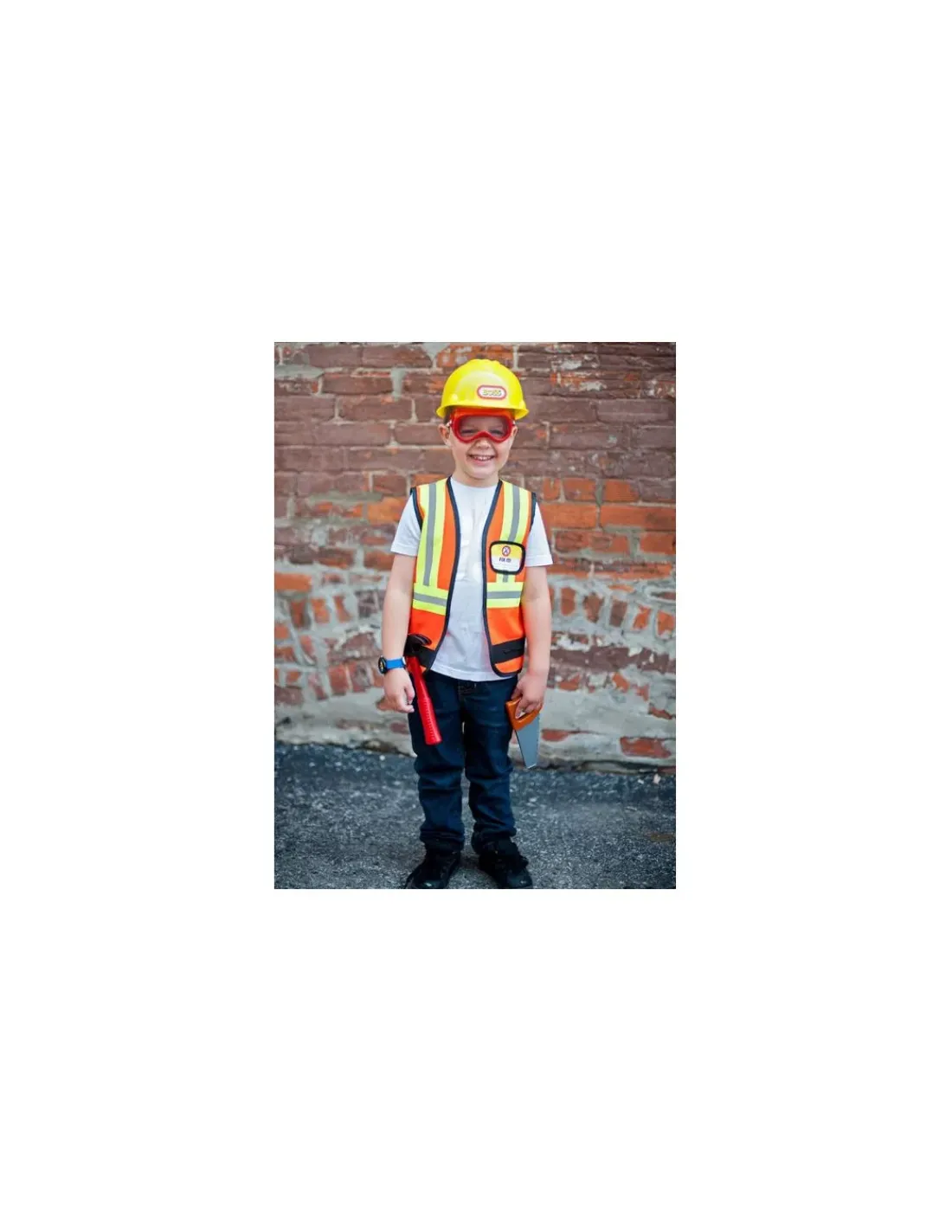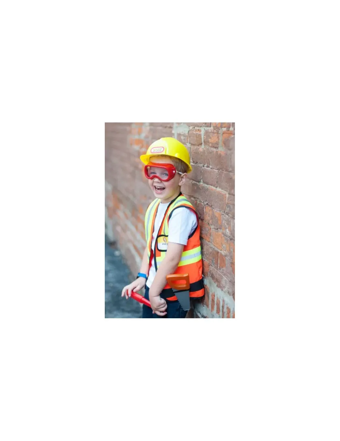 Cet ensemble comprend un gilet orange avec des bandes réfléchissantes, un casque avec décalcomanie, un marteau en plastique, une mini scie en plastique, des lunettes de sécurité en plastique et un porte-nom pour que tout le monde sur le chantier sache qui vous êtes.