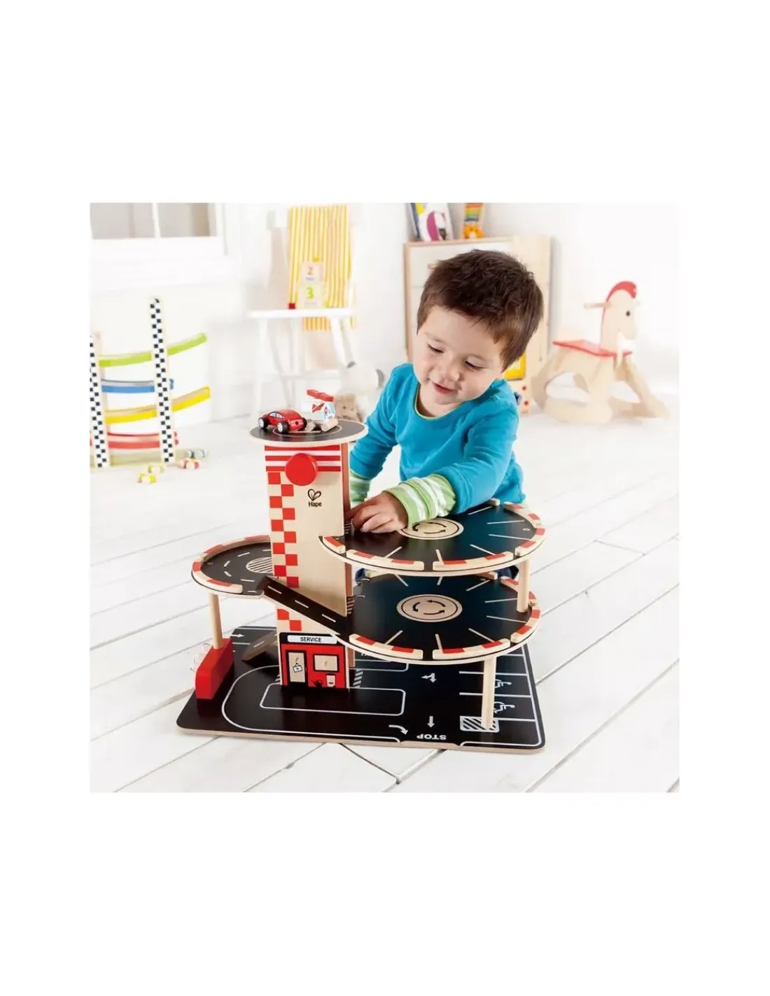 Découvrez le garage multi niveaux de Hape, un superbe garage en bois sur 4 niveaux avec 2 voitures et un hélicoptère.