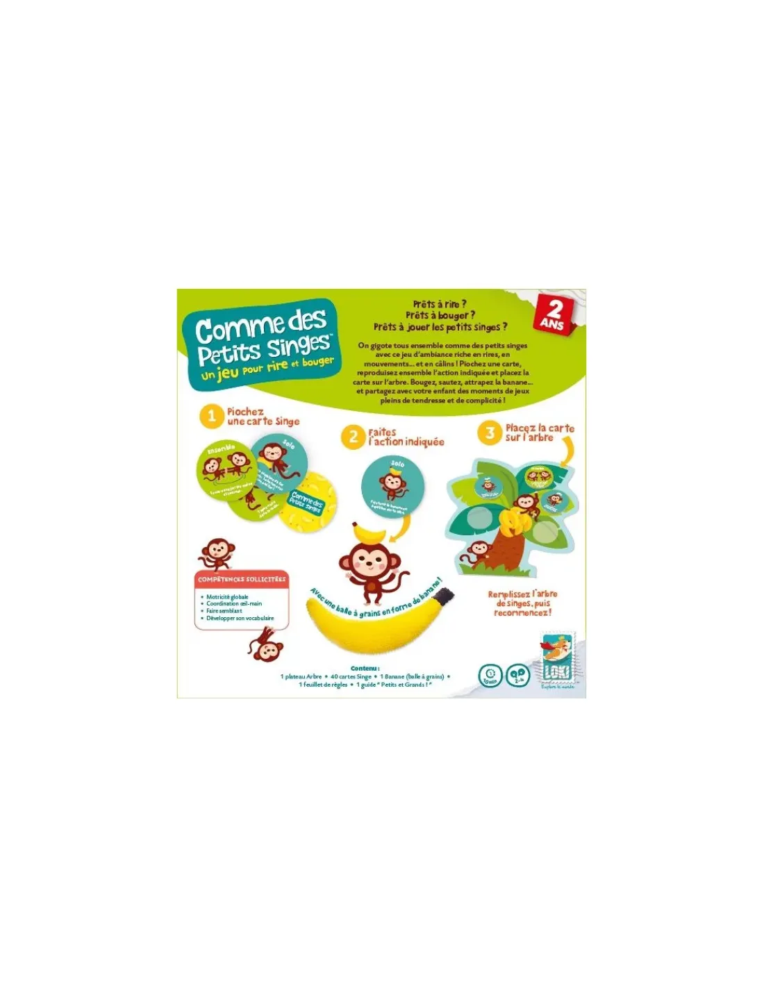 Bougez, sautez, attrapez la banane… Comme des petits singes est un jeu de défis, grâce auquel vous partagerez des moments de tendresse et de complicité en famille. Une véritable fabrique à fous rires pour nos petits marmots. Il n’y a pas de gagnant ou de perdant… amusez-vous, tout simplement!
