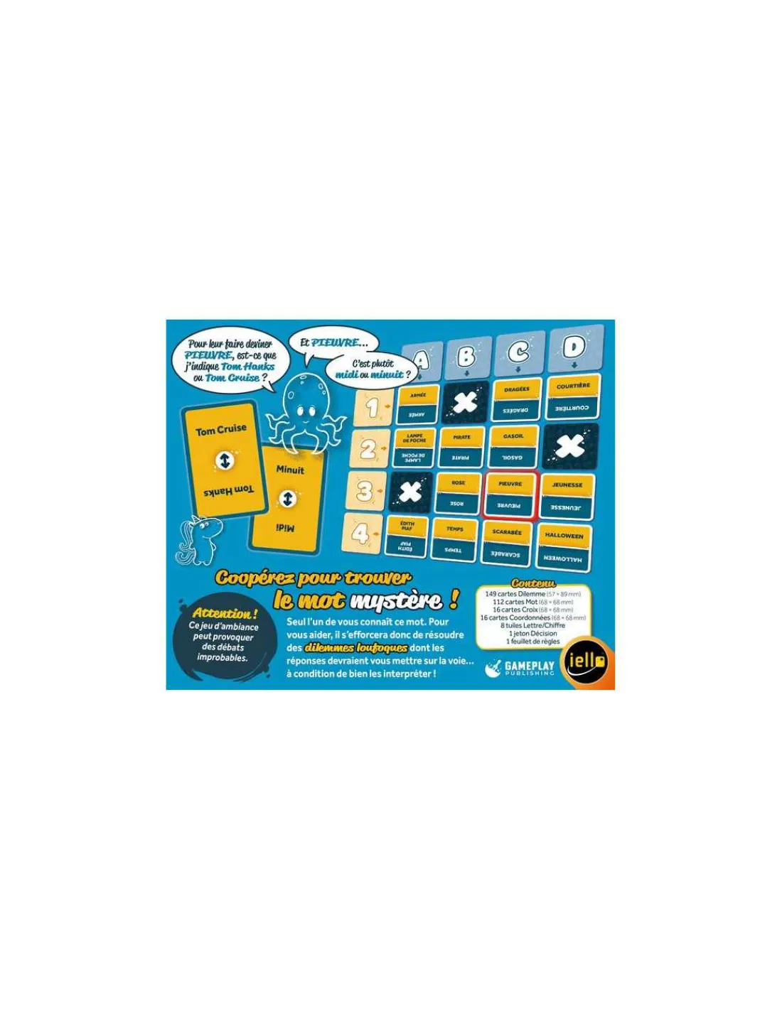 La boite de jeu contient 149 cartes « Dilemme », 16 cartes « Coordonnées », 112 cartes « Mot » recto verso, 8 tuiles Lettre/Chiffre et la règle du jeu.