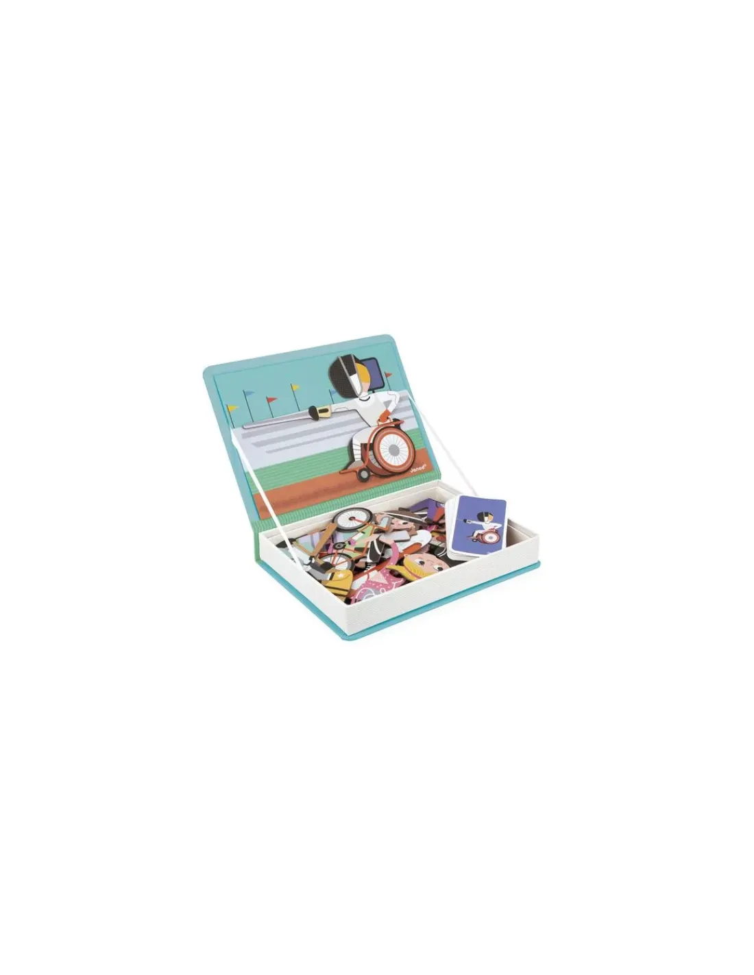 Présenté dans une boite livre à fermeture magnétique, ce jeu sur le thème du sport et de l’handisport s’emporte partout pour s’occuper à tout moment. Composé de 48 magnets et de 16 cartes, une fois le livre ouvert, le but du jeu est de recomposer sur la scène le personnage indiqué sur la carte à l’aide des magnets. Votre enfant pourra reconstituer un basketteur, un tennisman, un footballeur, un cycliste…