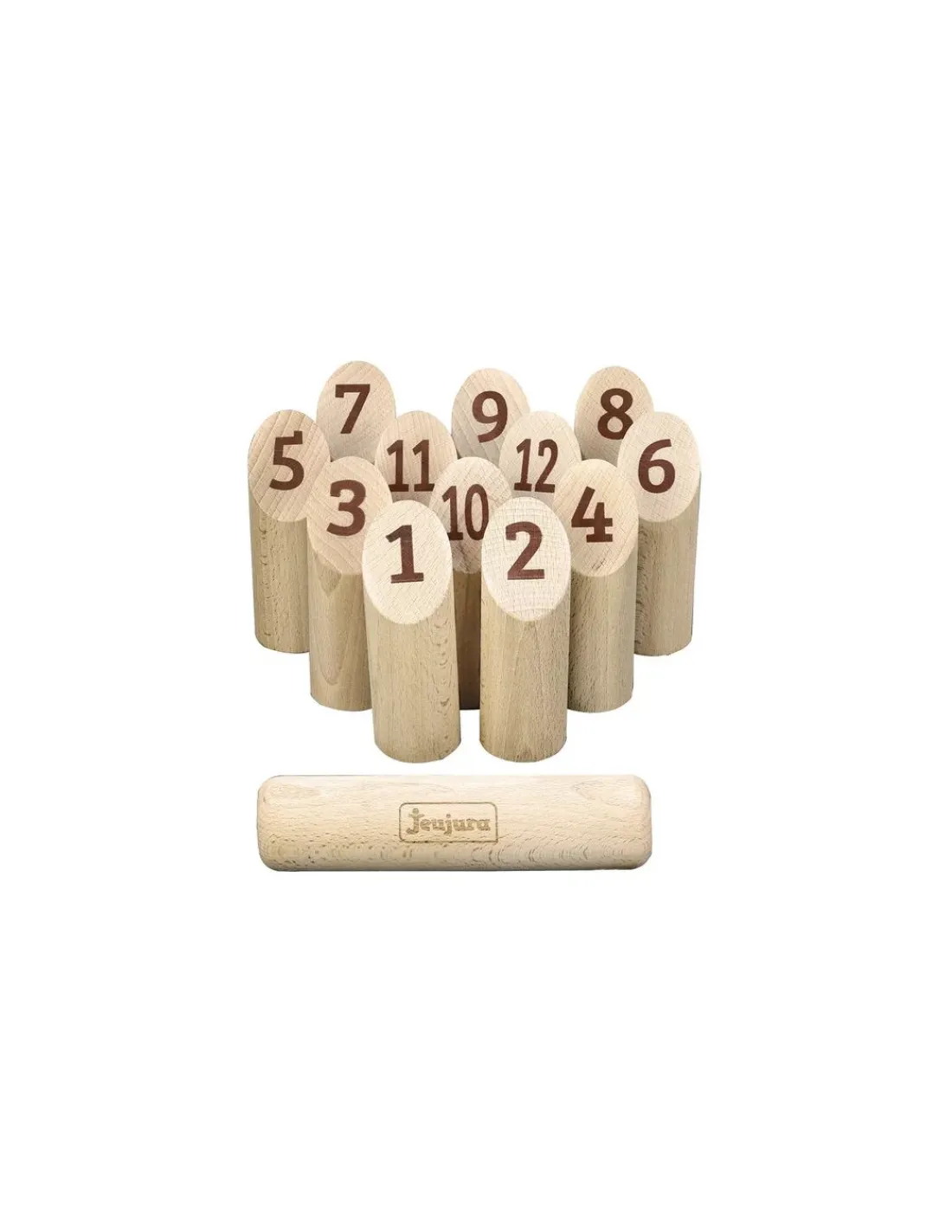 Ce jeu Juraquilles se compose de 12 quilles numérotées en hêtre, d’un bâton à lacer et d’un sac de rangement facile à transporter.