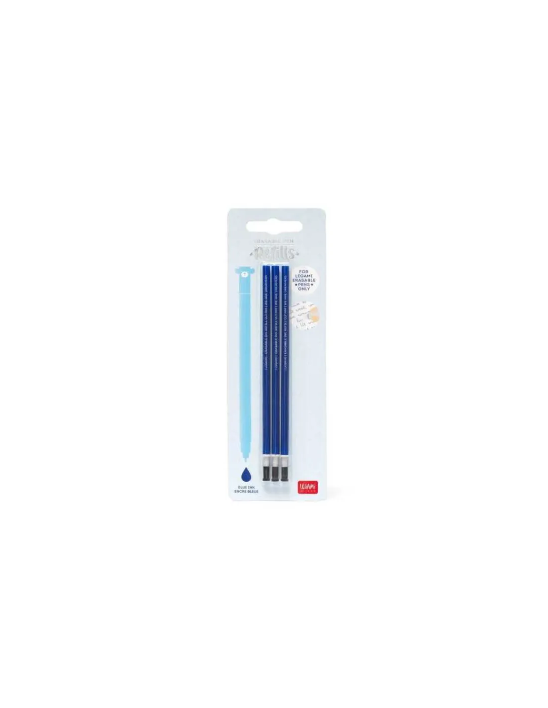 Découvrez les recharges pour stylo à encre gel effaçable Bleu de Legami, un lot de 3 recharges permettant de prolonger la durée de vie de vos stylos Legami, tout en vous assurant des corrections faciles grâce à leur encre effaçable.