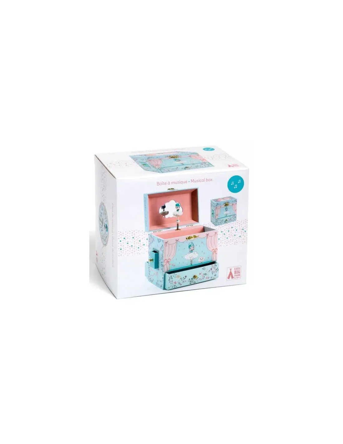 Une jolie boite à musique Djeco avec un grand compartiment pour ranger tout ses trésors, un compartiment secret pour ranger ses bagues et deux tiroirs pour ses secrets. Votre fille s’admirera devant le miroir silhouetté en forme de nuage et regardera danser la ballerine qui s’animera en musique à l’ouverture de la boite.