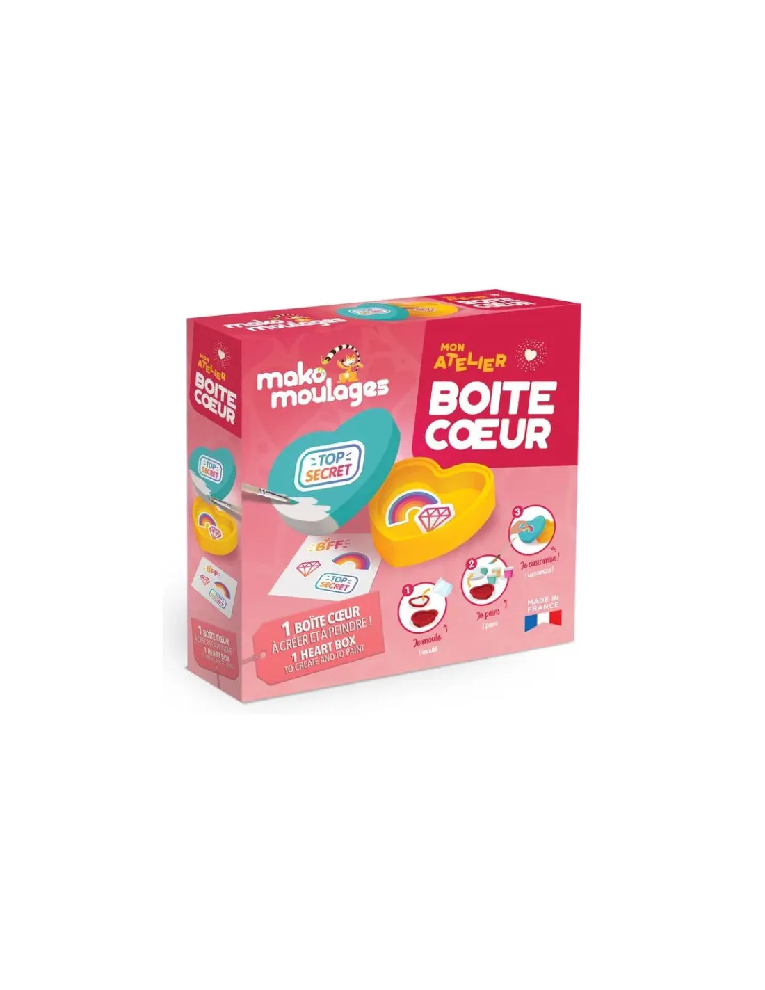 Découvrez Mon atelier Boîte Cœur de Mako Moulages, un coffret fabriqué en France pour les enfants dès 5 ans. Un coffret créatif pour mouler, démouler et peindre sa boite en forme de coeur.