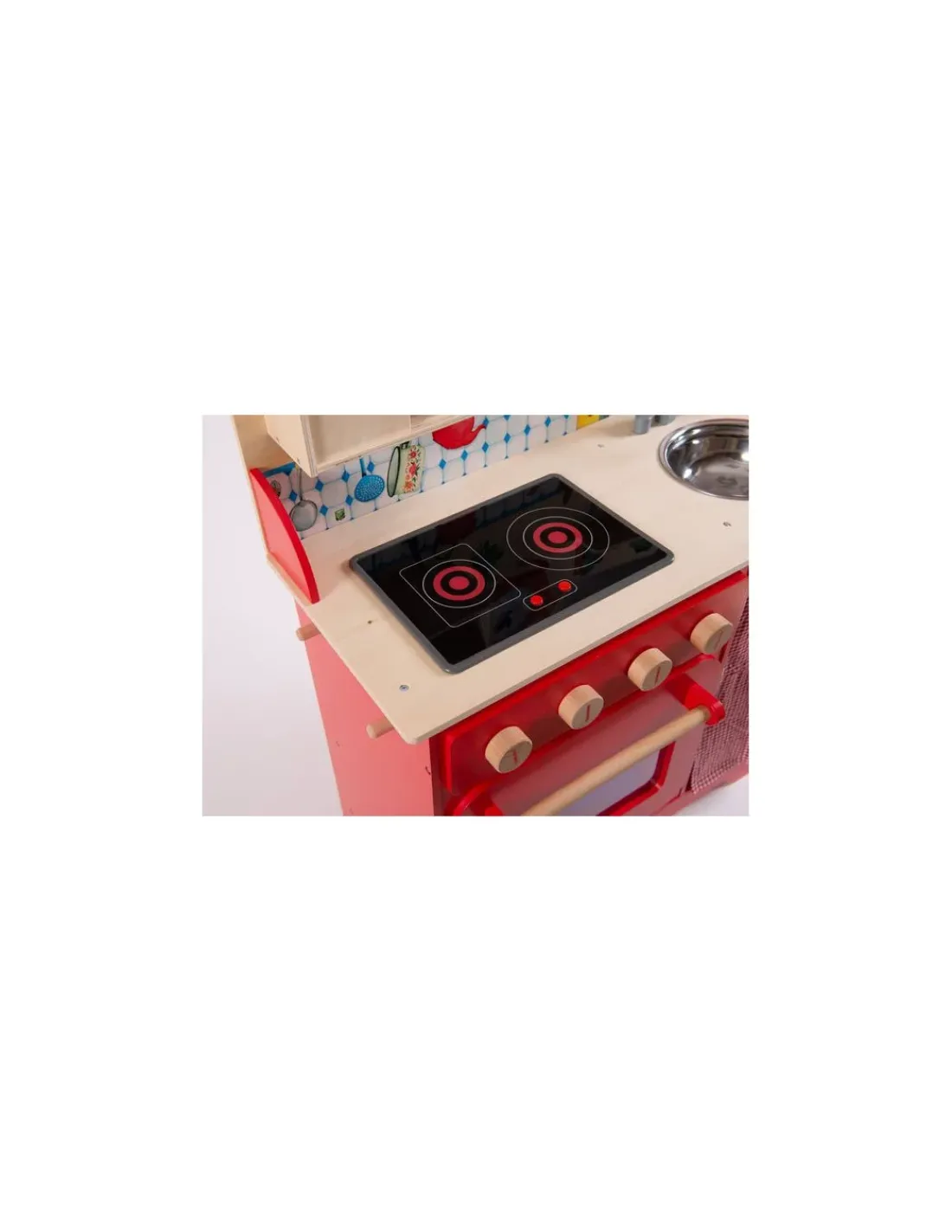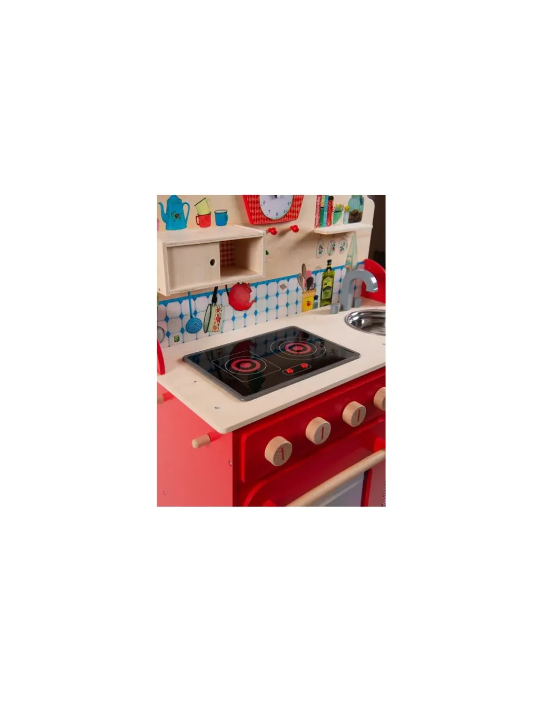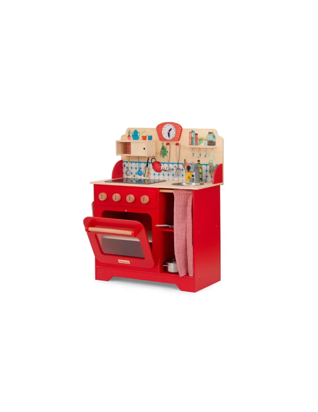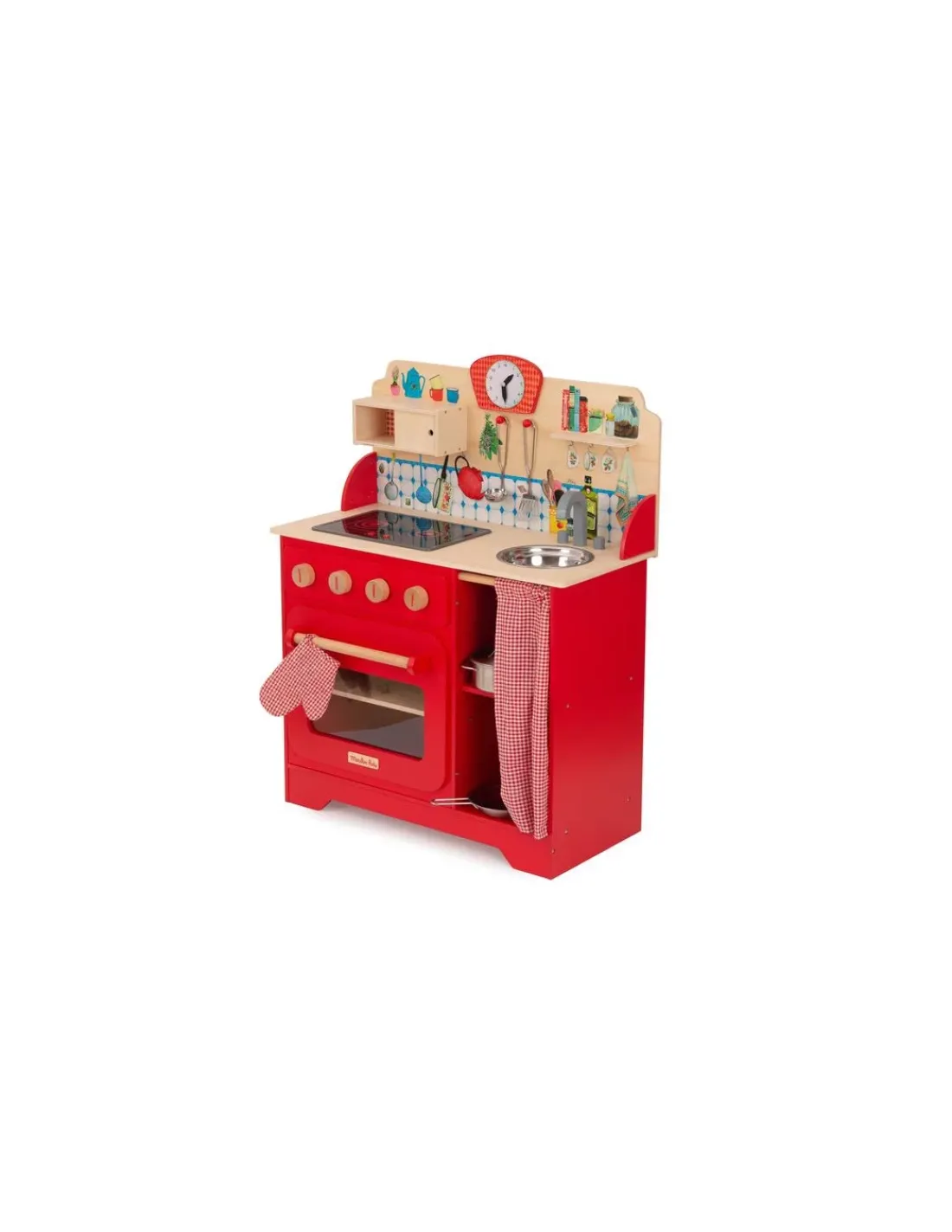 Découvrez la cuisinière de la collection La grande famille de Moulin Roty, une grande cuisine en bois rouge avec des accessoires pour cuisiner comme les grands dès 3 ans.