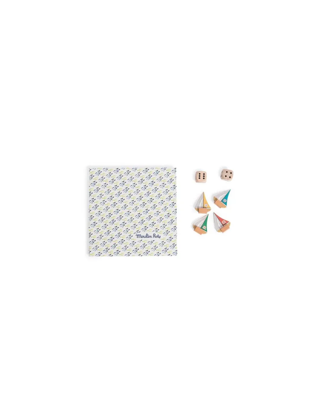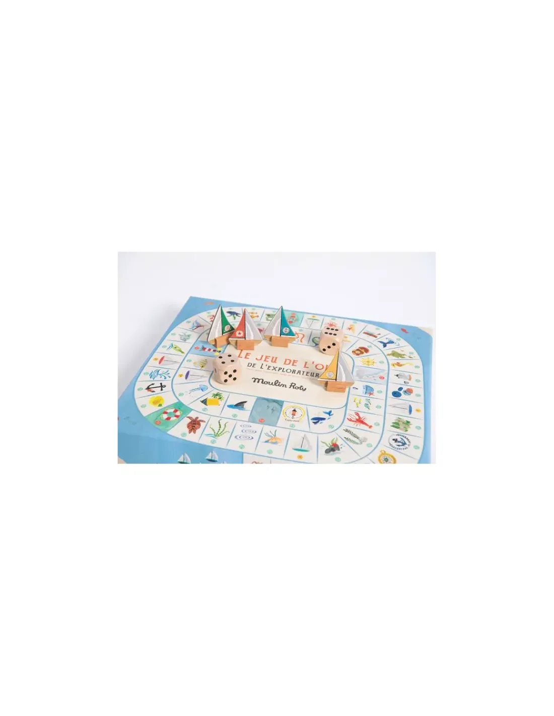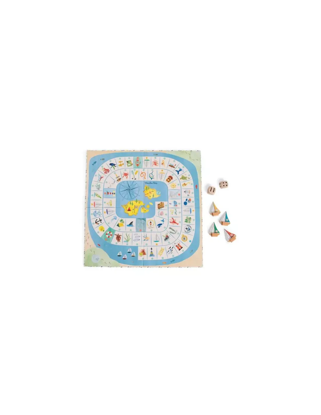 Le jeu jeu comprend 4 pions bateaux, 2 grands dés et un plateau illustré à l’aquarelle.
