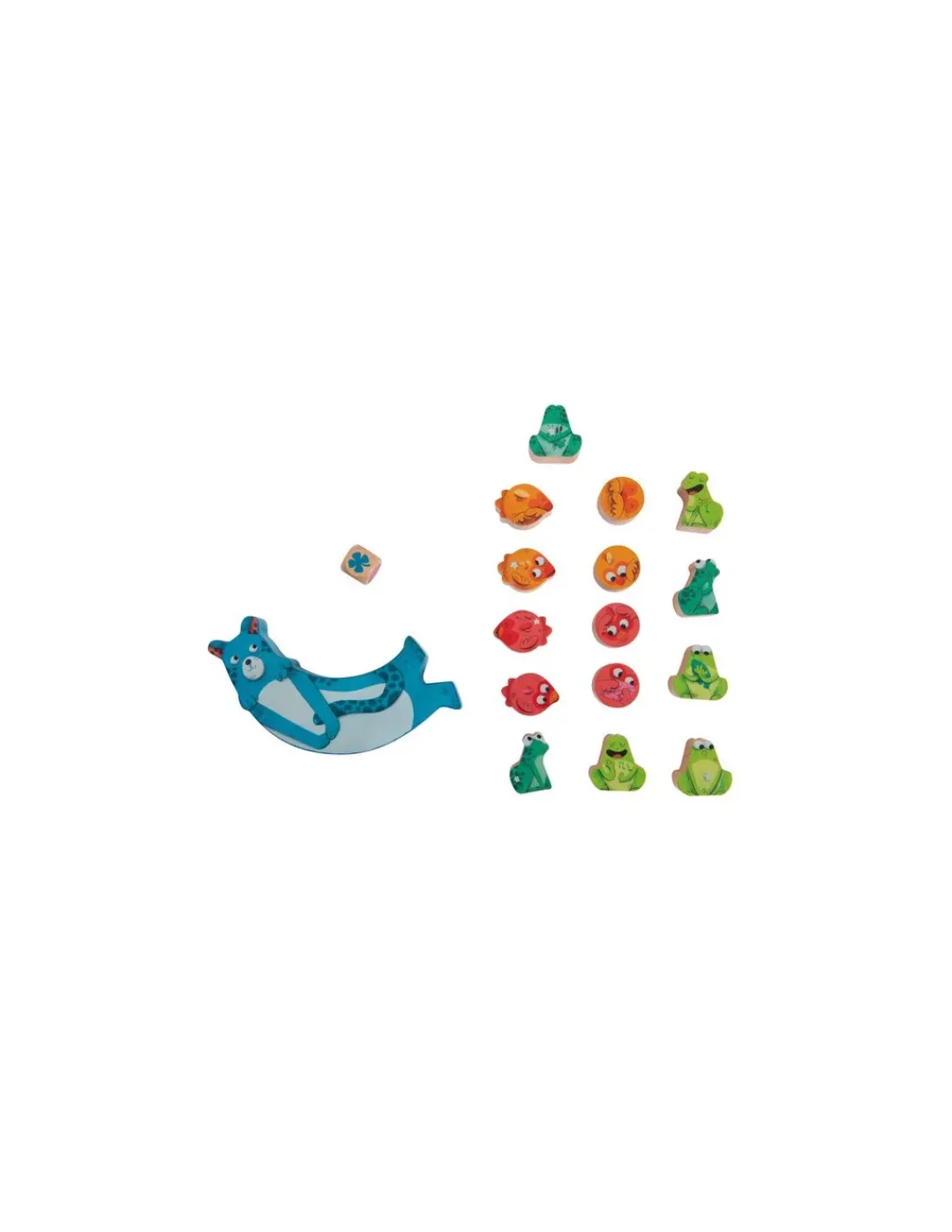 Lance le dé et essaye d’empiler les 15 pièces en bois, illustrant les joyeux habitants de la jungle. Le dé lancé affiche la couleur à placer en équilibre sur la panthère Zimba. Prends garde à ne pas tout faire tomber!