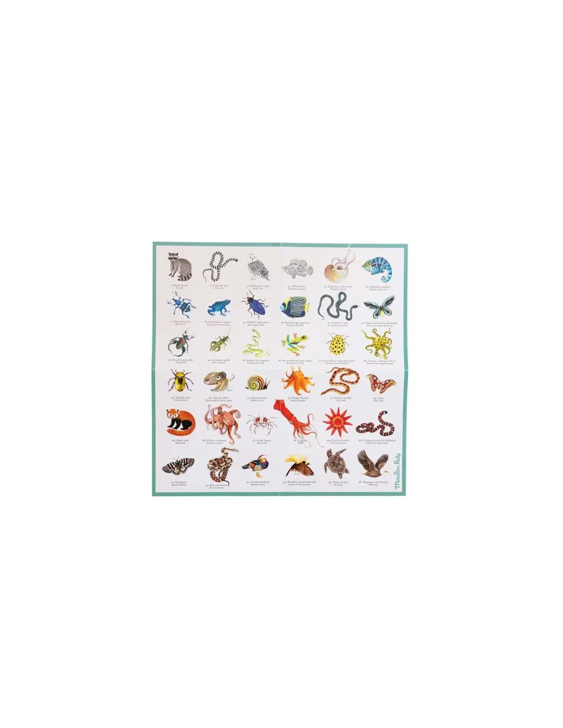 Toutes les cartes sont faces cachées sur la table, celui qui collecte le plus de paires d’animaux est le gagnant. Le jeu contient 36 cartes animaux x 2 et 1 poster.