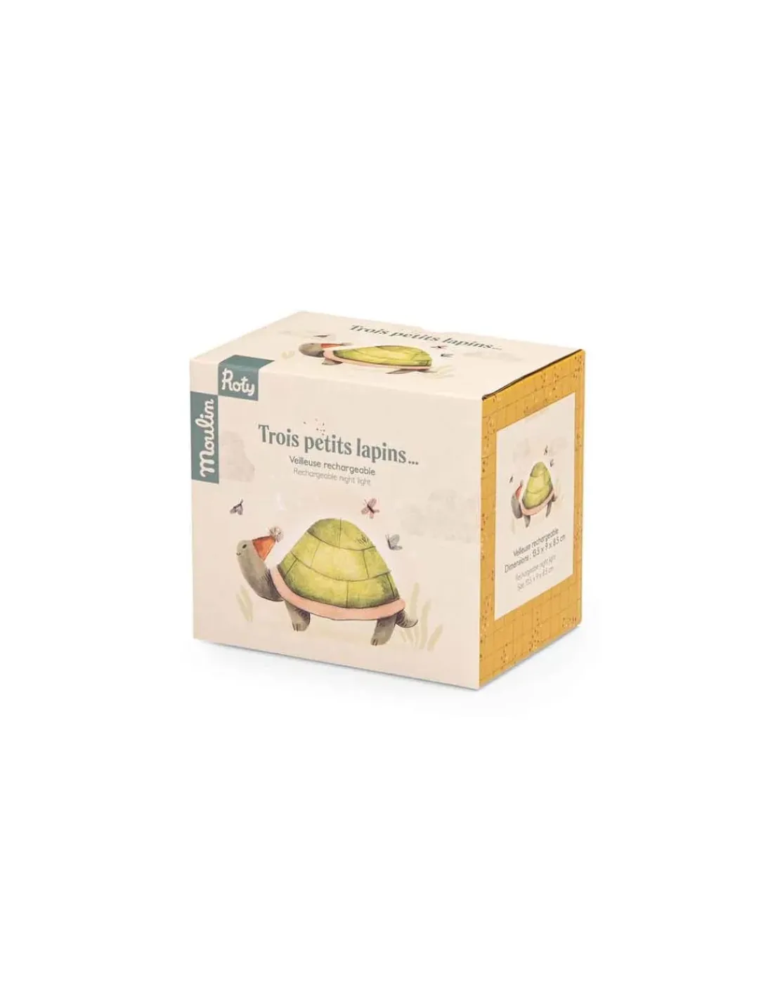 Découvrez la veilleuse tortue de la collection Trois Petits Lapins de Moulin Roty, une douce veilleuse pour décorer la chambre et apaiser les nuits de bébé en diffusant une douce lumière.