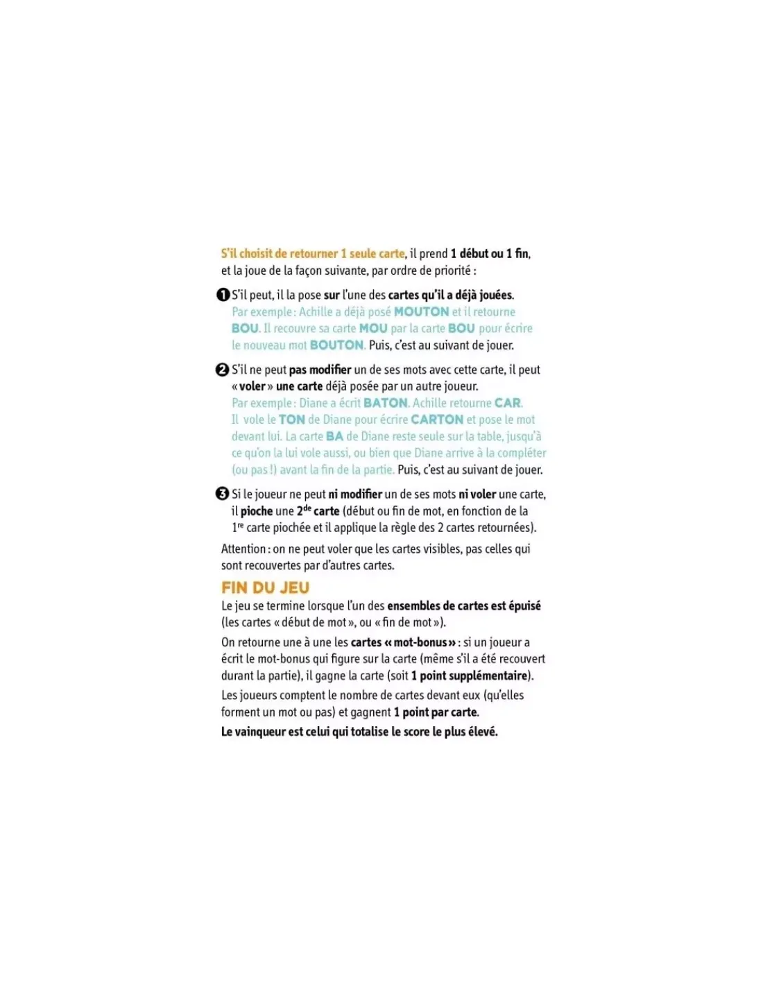 Le jeu contient 32 cartes syllabes: 20 cartes début de mot, 12 cartes fin de mot, 10 cartes mot bonus, 1 carte mémo et la règle du jeu.