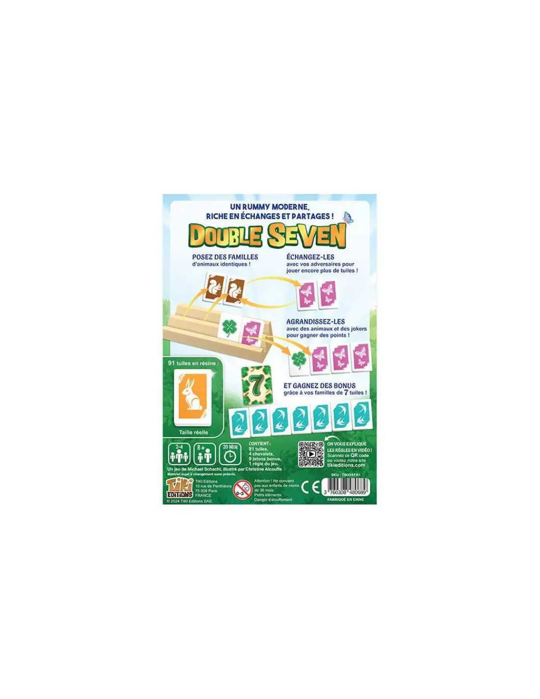 Découvrez le jeu Double Seven de Tiki Editions, un jeu de société intergénérationnel pour jouer de 2 à 4 joueurs à partir de 8 ans. Un Rummy moderne mêlant échange et partage. Posez, échangez et agrandissez des familles d’animaux!