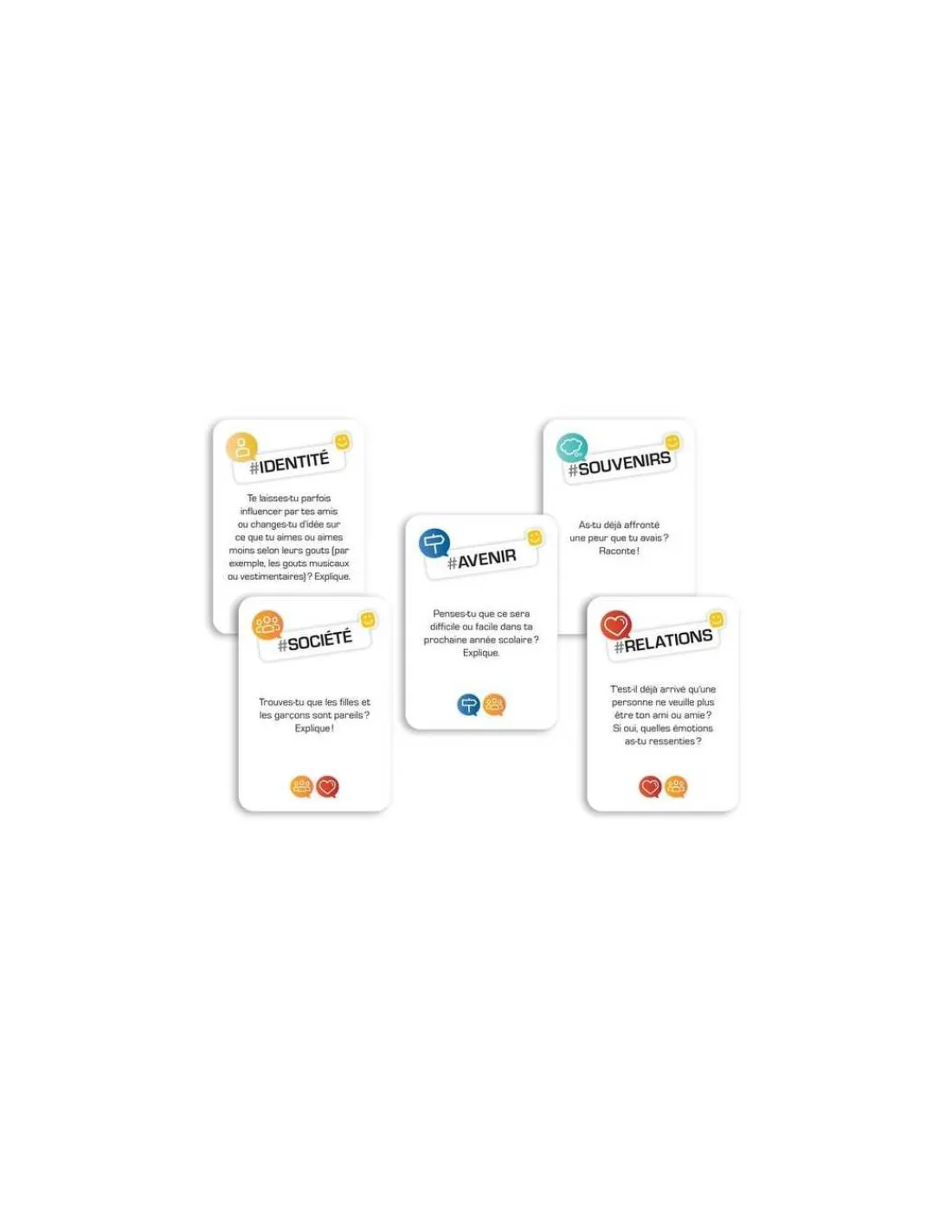 Ce jeu permet aux enfants de s’exercer à partager leur point de vue, à écouter et à respecter le point de vue des autres, mais aussi de s’exprimer sur des sujets variés tels des sujets de société, d’identité ou portant sur les relations, l’avenir ou les souvenirs. Le jeu comprend des cartes « Questions » réparties en 5 catégories et plusieurs cartes spéciales permettant d’esquiver des questions. Il laisse ainsi place à la stratégie et au hasard pour créer un contexte de discussion permettant aux parents d’échanger avec leur enfant, de découvrir son point de vue et de mieux comprendre comment il se définit.