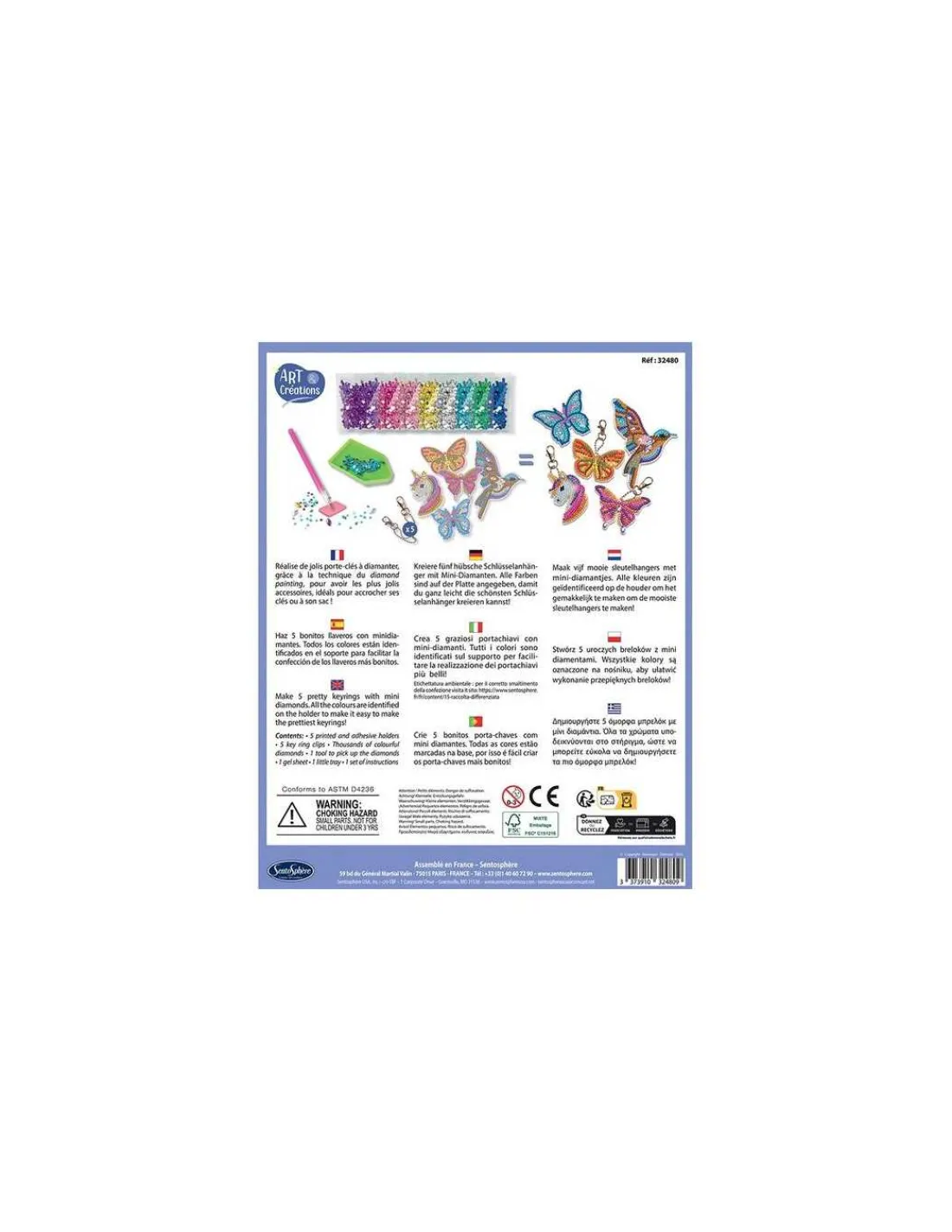Découvrez les porte-clés à diamanter de Sentosphère, un loisir créatif pour les enfants à partir de 8 ans qui vont créer plus 5 porte-clés diamantés en recouvrant de jolis motifs de milliers de strass multicolores.