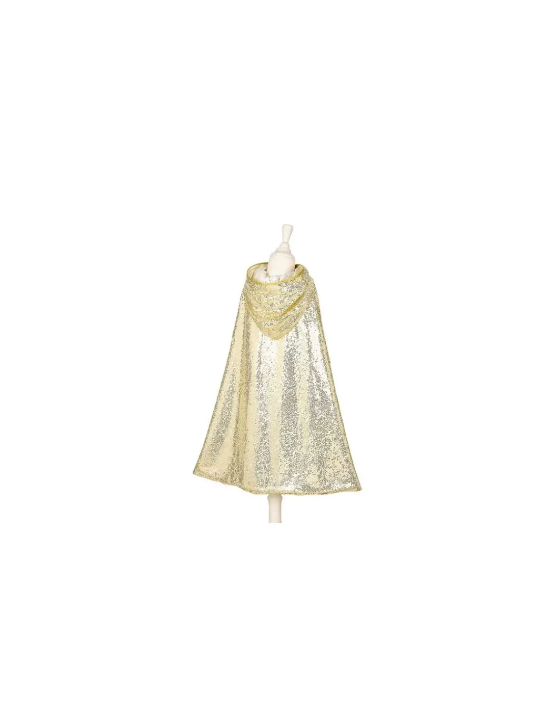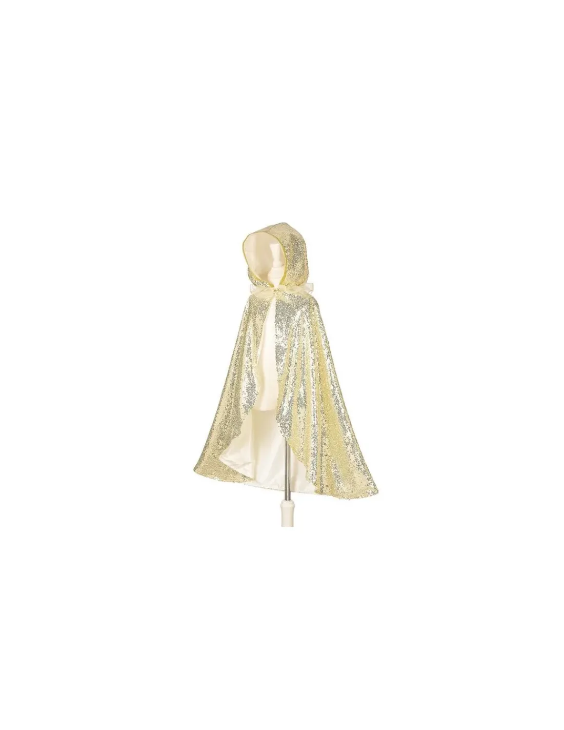 Enfilez votre cape, mettez la capuche sur votre tête et transformez-vous en princesse. Une cape dorée avec des sequins et un ruban. Un accessoire de déguisement parfait à enfiler très facilement.