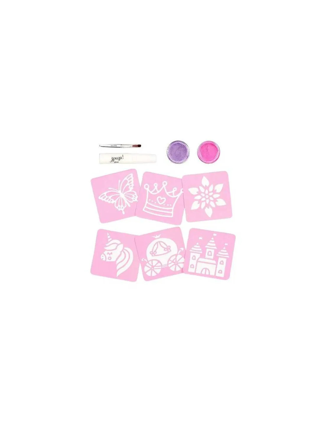 Découvrez le set de tatouages glitter Princesse de Souza, un coffret cadeau de maquillage pour les enfants à partir de 6 ans où vous allez réaliser des tatouages avec des pochoirs sur le thème des princesses.