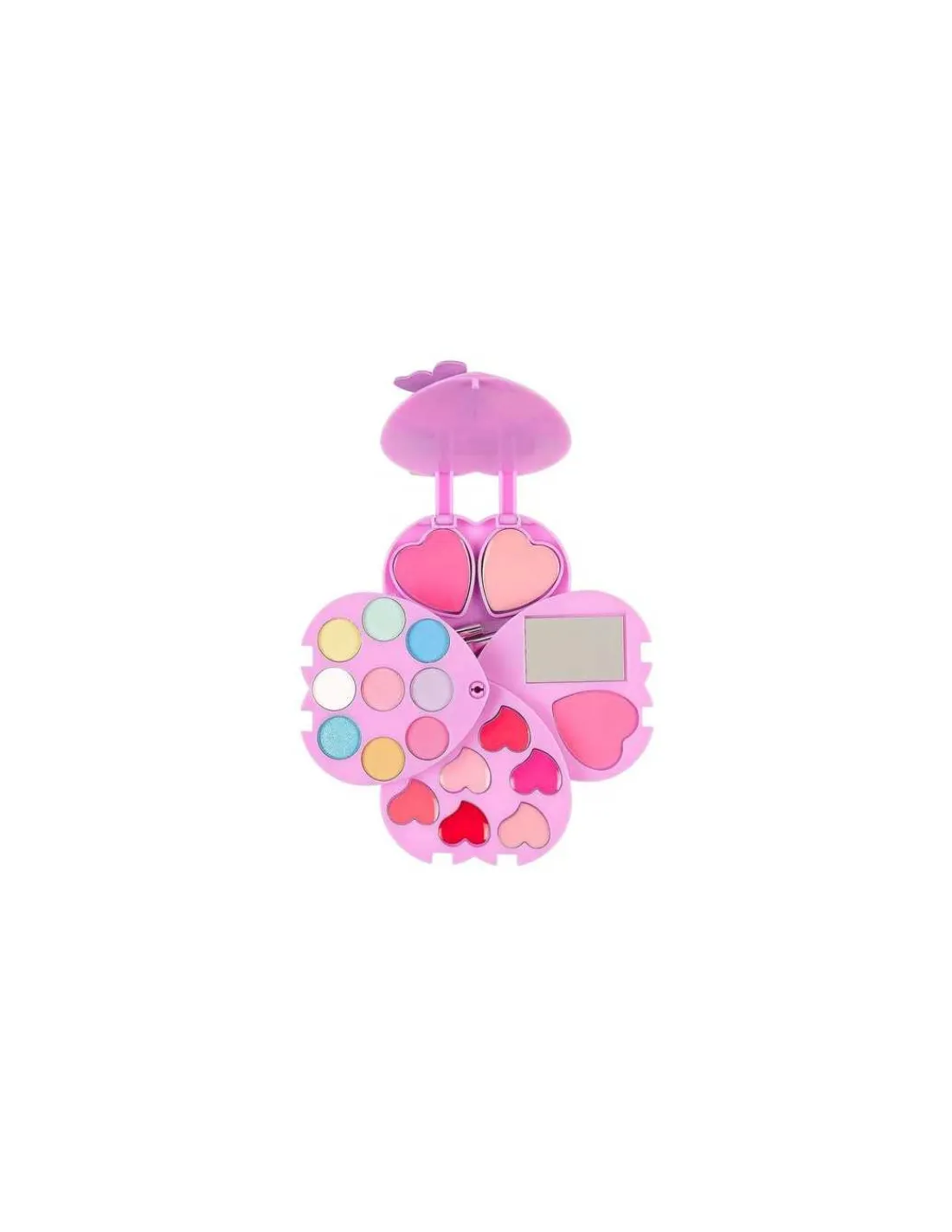 Ce kit de maquillage contient différentes couleurs de fard à paupières, de brillant à lèvres et de blush dans un coffret coeur à quatre compartiments de maquillage. Un format pratique à emporter partout.