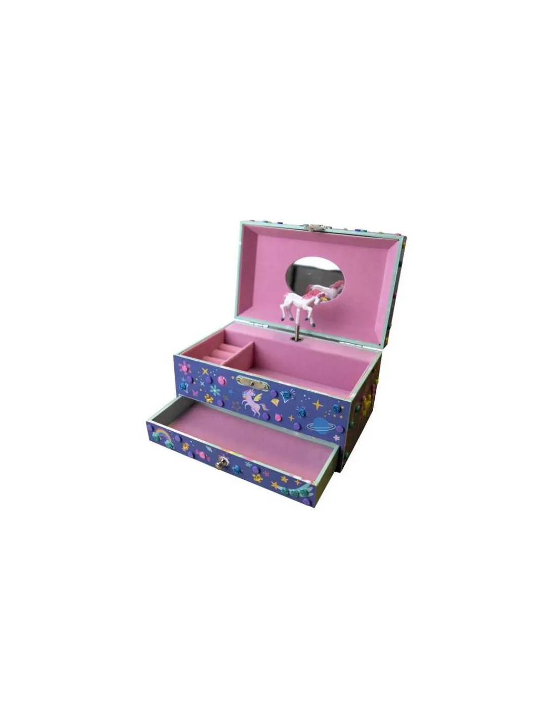 Décorez une magnifique boite à musique, il suffit de coller les petites mousses et joyaux étincelants sur les graphismes correspondants. Un très joli coffret à bijoux pour ranger ses bagues, ses bracelets, ses barrettes… et regardez tourner la licorne au son de la mélodie.