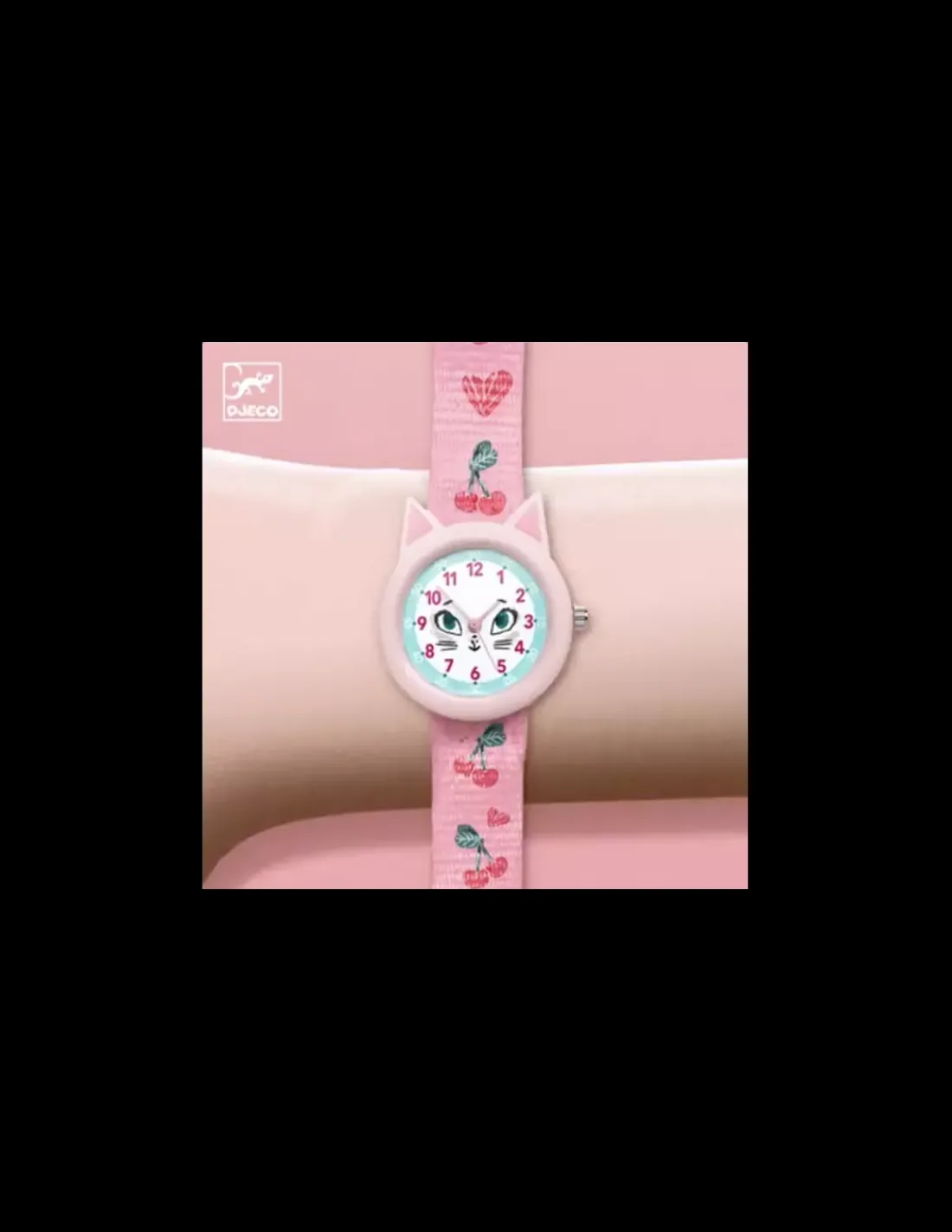 Découvrez la montre chat Ticlock de Djeco, une montre élégante et colorée pour apprendre à lire l’heure en s’amusant. De couleur rose avec des cerises sur le bracelet, vous allez beaucoup apprécié son cadran représentant une tête de chat avec ses oreilles en volume.