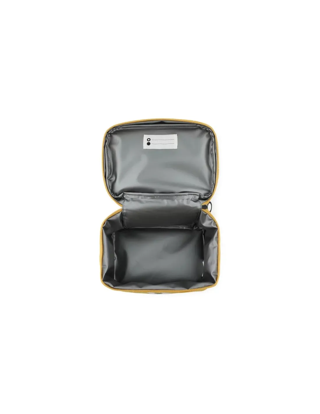 Un sac repas jaune, ludique, astucieux et compact, qui bénéficie d’un revêtement de protection imperméable.