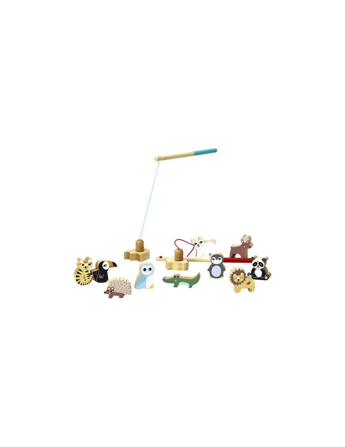 Le coffret contient 12 animaux en bois magnétiques, 2 cannes à pêche en bois magnétiques, un sac en tissu, 4 cartes de loto, un plateau recto/verso et 1 dé.