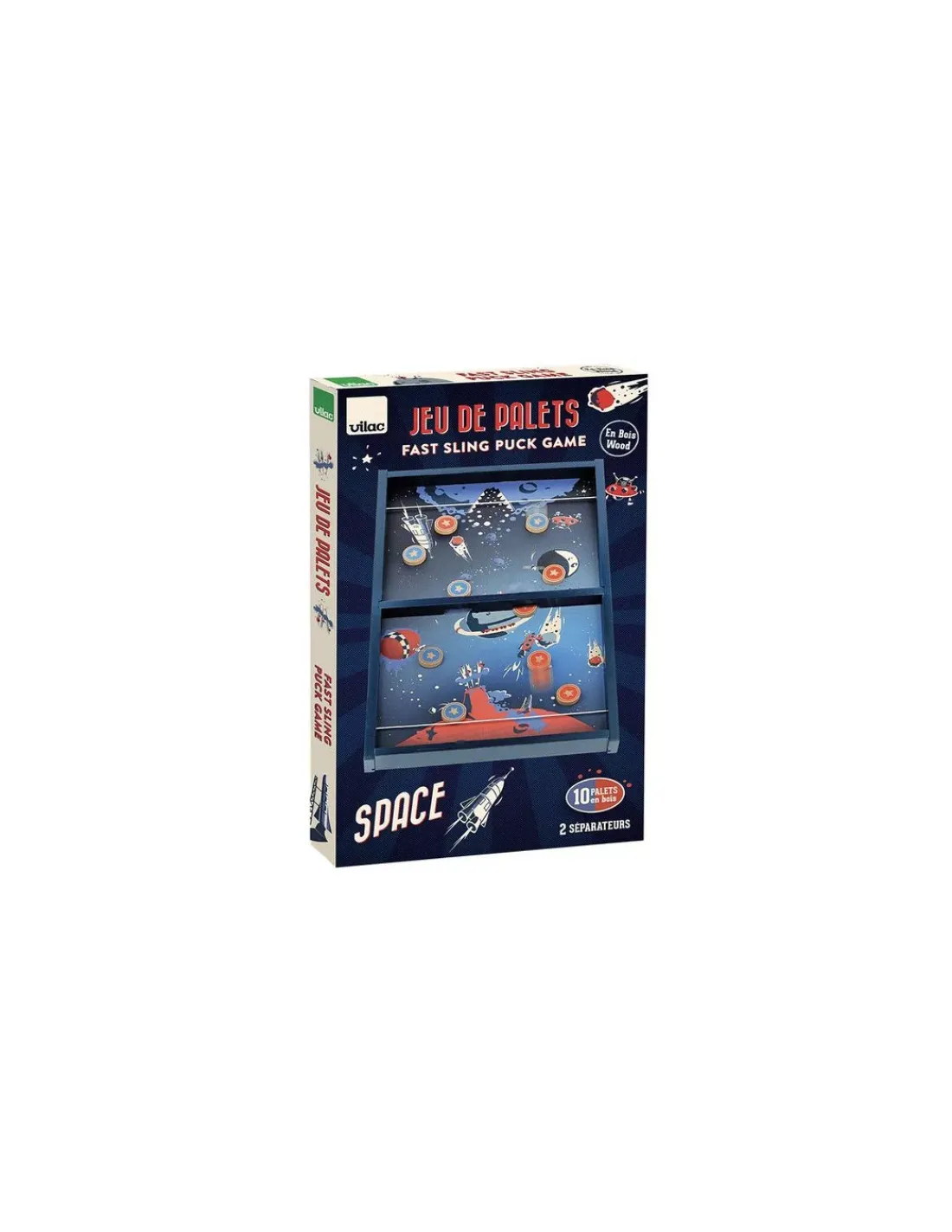 Voyagez dans l’espace, à bord du vaisseau Vilac dans ce magnifique jeu de palet au look vintage. Le but est de se débarrasser de tous ses palets avant son adversaire ou, encore plus difficile, de ne plus avoir un seul palet de son côté. Il faut se servir de l’élastique de son côté comme lanceur et être le plus habile pour viser l’unique trou au centre du jeu. Pour les meilleurs tireurs, un autre obstacle avec 2 trous décentrés peut se substituer au centre.