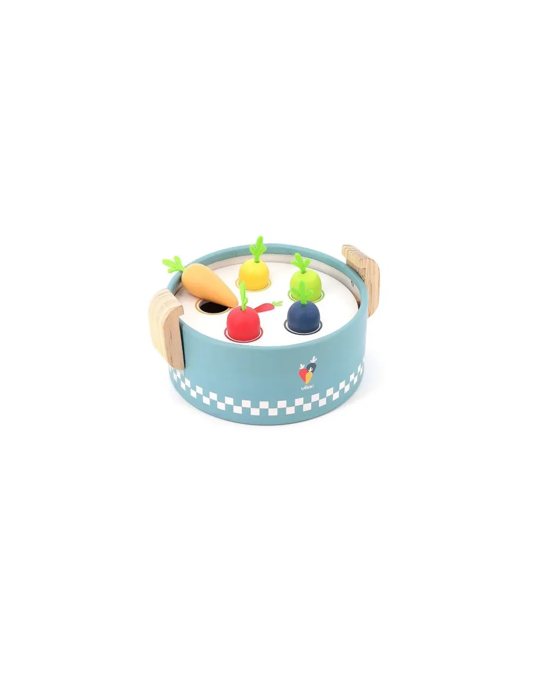 Un jeu d’éveil en forme de popotte pour cuisiner. En dévissant le couvercle, les petits découvrent 3 plateaux d’activité interchangeables: un poisson, du poulet et une crevette à encastrer sur un étage, 5 légumes à glisser dans la forme correspondante dans un autre plateau et enfin 5 petites carottes multicolores à planter suivant leur couleur aux bons emplacements dans le dernier plateau.