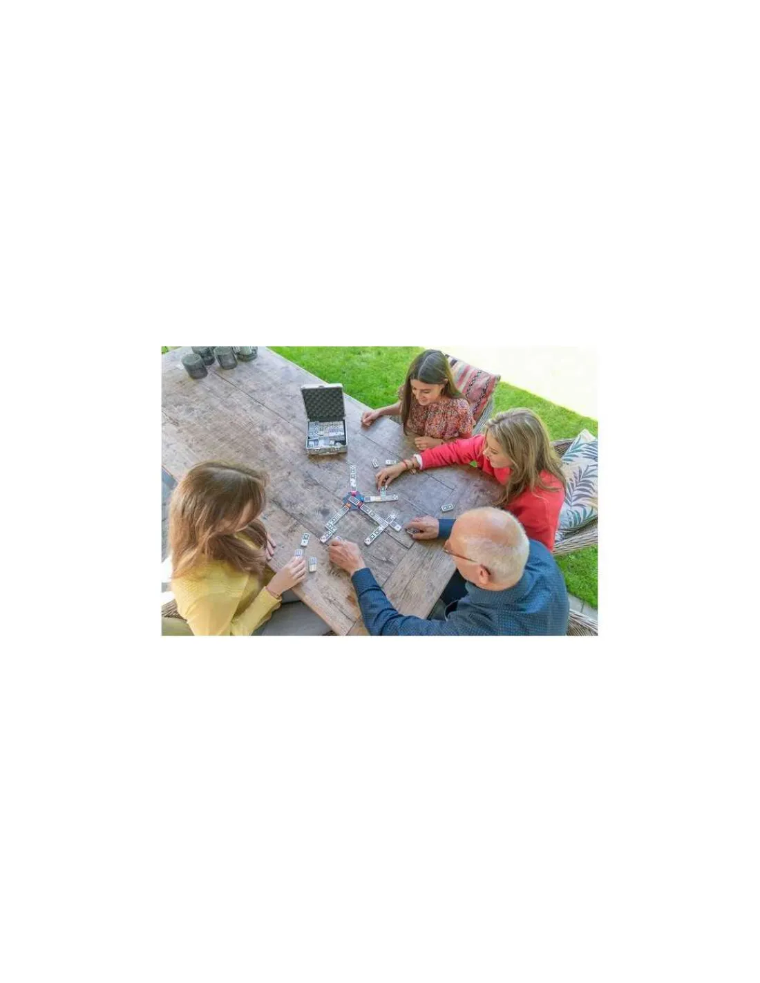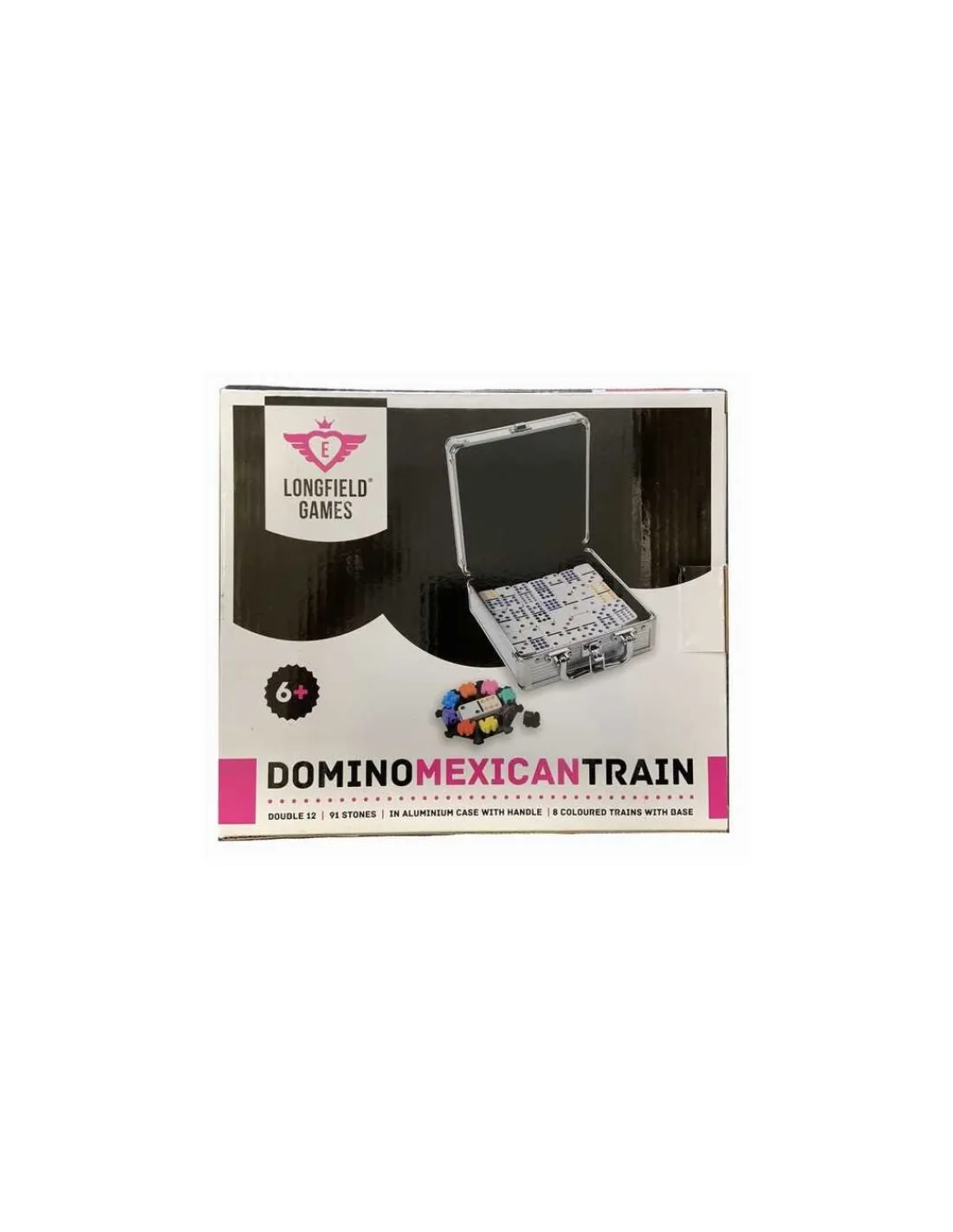 L’ensemble se compose d’une magnifique valisette en aluminium avec 91 dominos, jusqu’au double 12, d’une gare et de 9 trains colorés, ainsi que la règle du jeu en plusieurs langues.