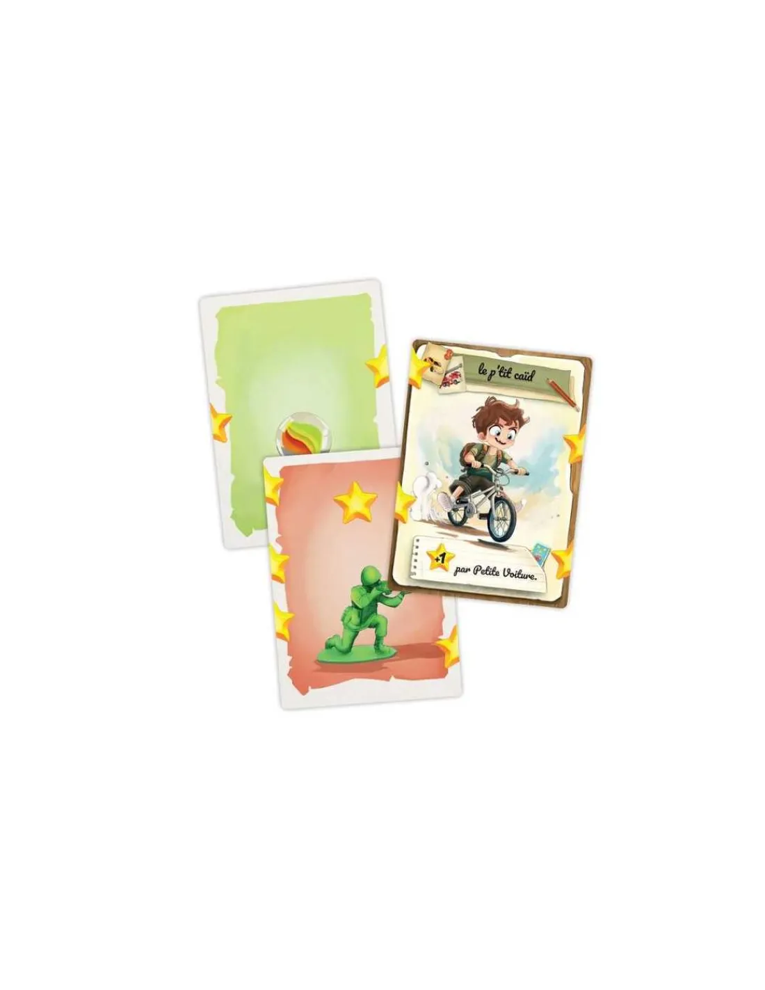 À votre tour, vous pourrez retourner 3 cartes « Feuiles » et découvrir ce qui s’y cache. Vous pourrez en garder une mais vous devrez aussi en donner une à un autre joueur, avant de remettre la troisième sous le tas de feuilles. Votre identité secrète sera révélé à la fin de la partie. Incarnez l’un des huit personnages de la cour d’école tout en cachant votre identité pour marquer plus d’étoiles que les autres!