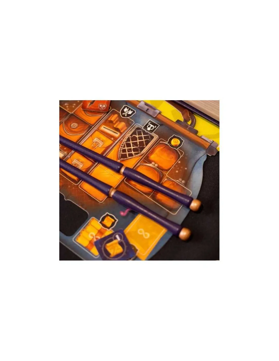 La boite de jeu contient 1 boîte-livre magique, 4 plateaux Malle Magique, 4 baguettes magiques, 8 tuiles Salle, 9 jetons Potion, 9 jetons Grimoire, 12 jetons Sorcier, 26 jetons Cachés, 38 jetons Visibles, 6 jetons Spéciaux, 12 cartes Sort, 1 chat-riatide en trois parties et la règle du jeu.