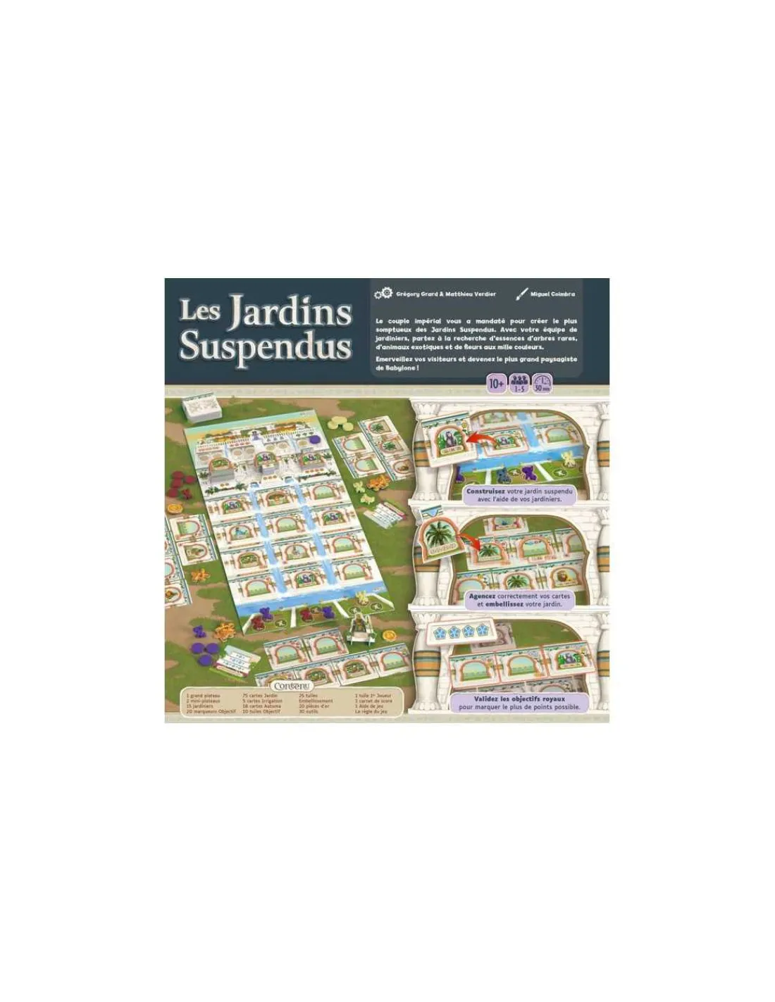 Vous incarnez un paysagiste chargé par le roi de Babylone Nabuchodonosor II d’aménager les jardins suspendus pour la reine Amytis. Au cours des 4 manches de la partie, vous devez utiliser au mieux votre équipe de jardiniers pour réaliser le jardin suspendu qui plaira le plus au couple royal, placez des fleurs, des arbres, des animaux pour embellir vos jardins. Invitez des grands noms de Babylone et remplissez des objectifs pour marquer un maximum de points de renommée.
