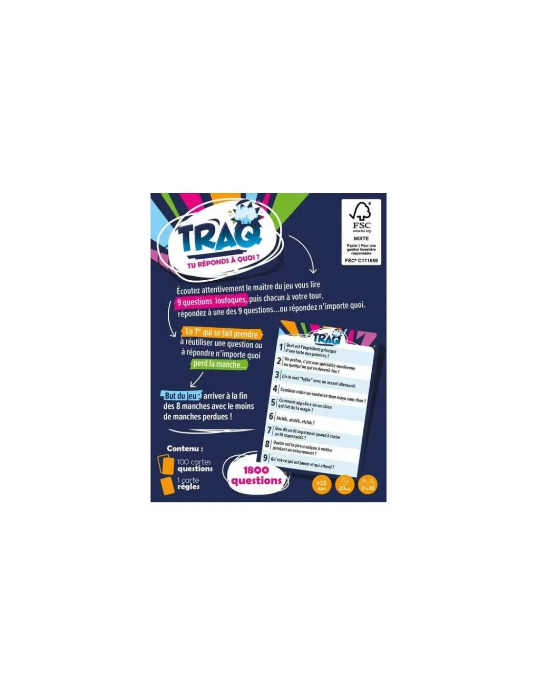 Le principe est simple : vous allez devoir écouter attentivement le maître du jeu vous lire 9 questions plus ou moins loufoques, puis, chacun votre tour, répondre à une des 9 questions… ou répondre n’importe quoi. Le premier qui se fait prendre à réutiliser une question ou à répondre n’importe quoi perd la manche! Pour gagner, il vous faudra arriver au bout des 8 manches avec le moins de manches perdues.