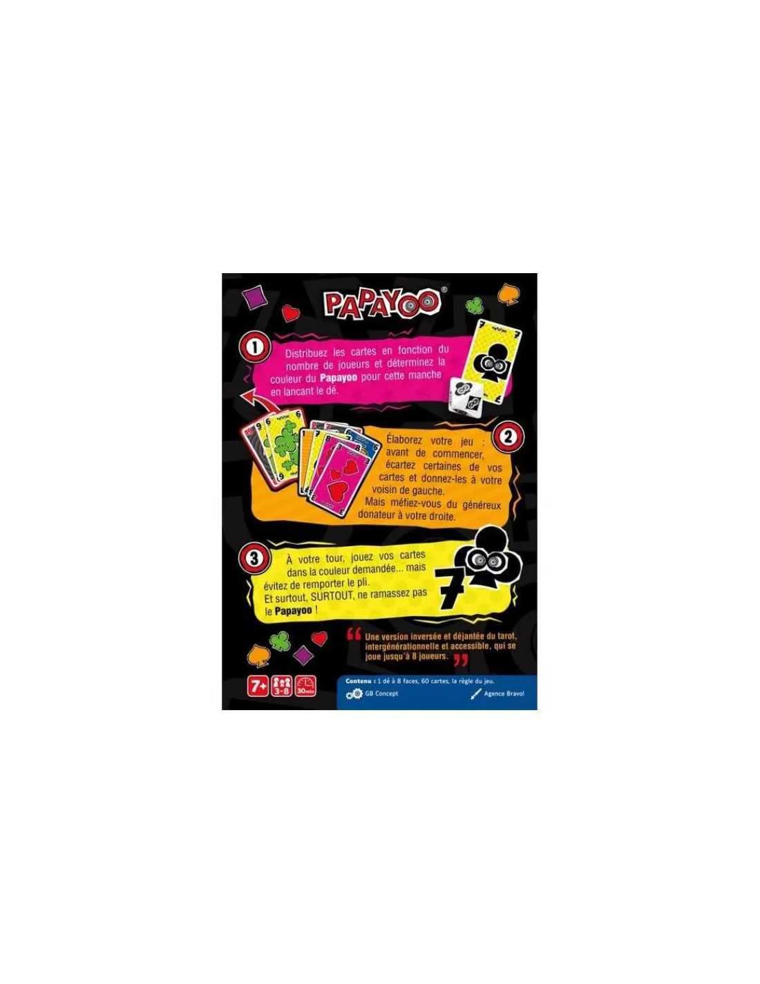 Comment marquer le moins de points possible : en évitant de récolter ces fichus Payoos et surtout le Papayoo, ce satané 7 dont la couleur change en fonction du dé à chaque manche.
