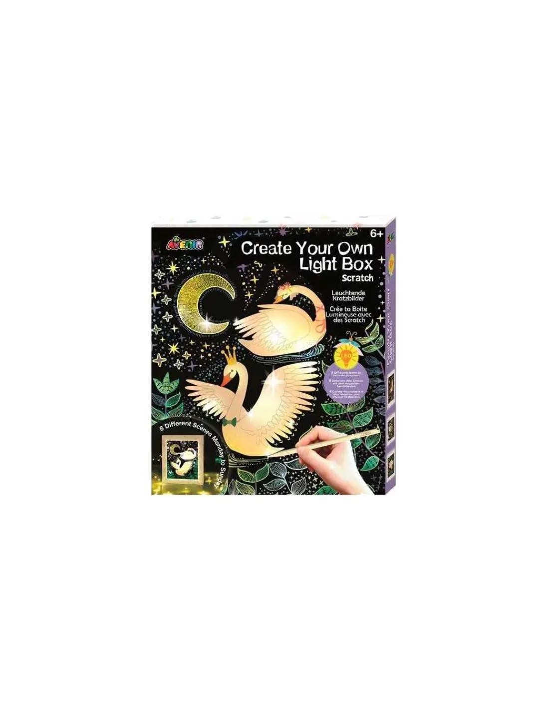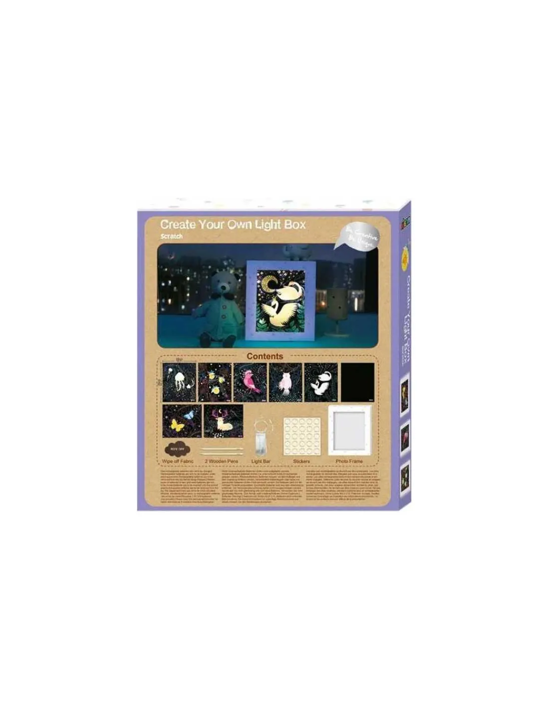Ce kit permet de créer une magnifique boîte lumineuse en grattant des planches rhodoïd colorées et en les plaçant dans la boîte avec une guirlande lumineuse pour illuminer la chambre de votre enfant. Avec six planches différentes incluses, dont deux phosphorescentes, les possibilités de décoration sont nombreuses, offrant une expérience personnalisable et renouvelable selon les envies.