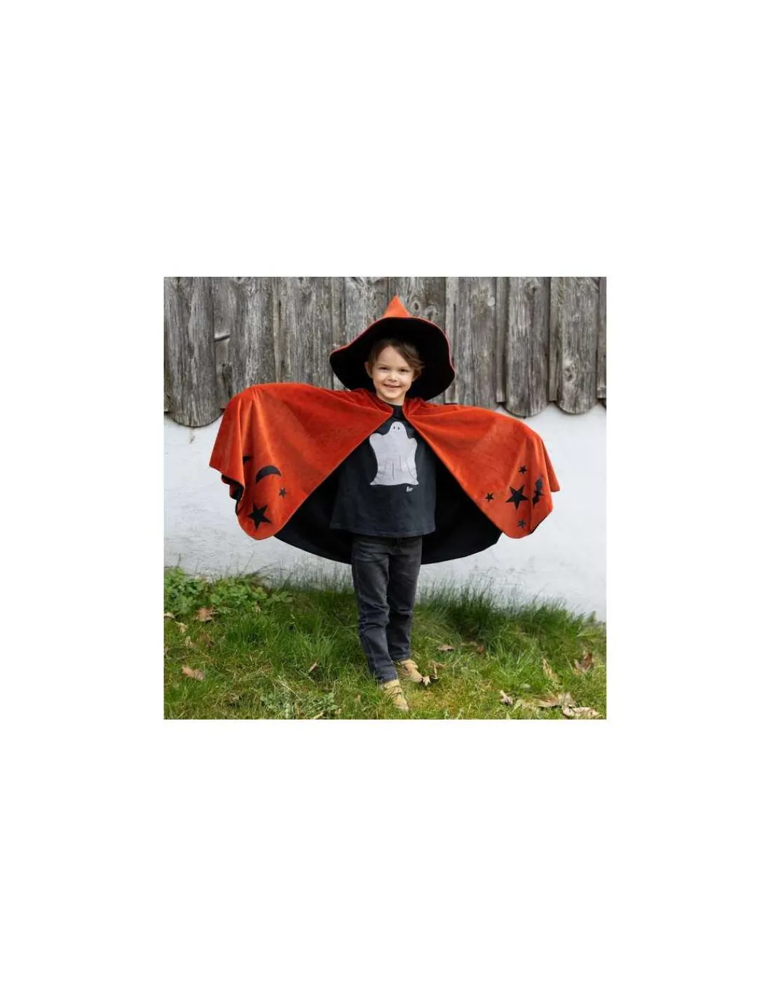 Confectionné en velours orange profond, ce costume deux pièces scintille comme des braises incandescentes sous la lune d’automne. La cape fluide est dotée d’une fermeture velcro confortable au niveau du cou, tandis que le chapeau pointu de sorcier assorti apporte une touche mystique parfaite.